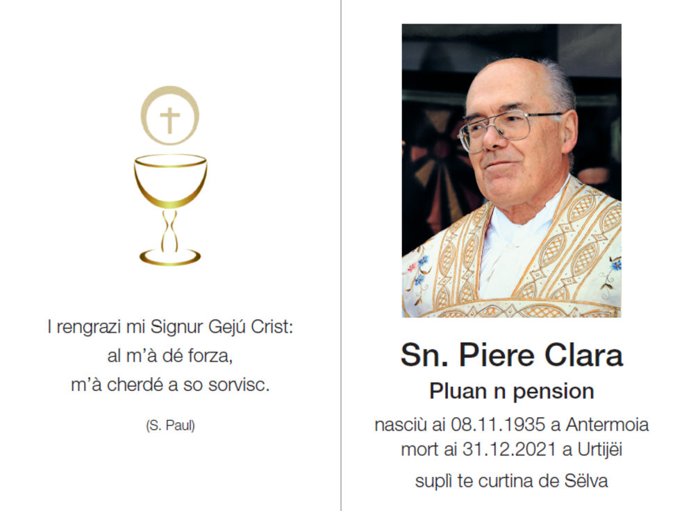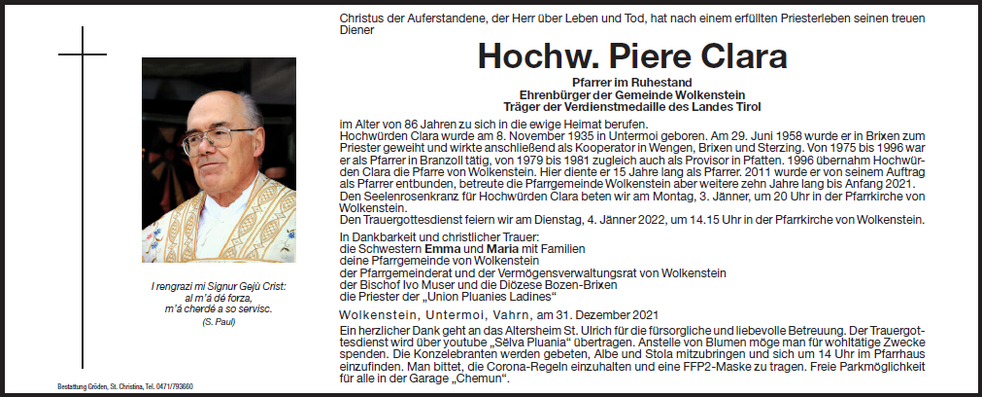 Den Seelenrosenkranz für Hochwürden Clara beten wir am Sonntag, 2. Jänner, und am Montag, 3. Jänner, um 20 Uhr in der Pfarrkirche von Wolkenstein.