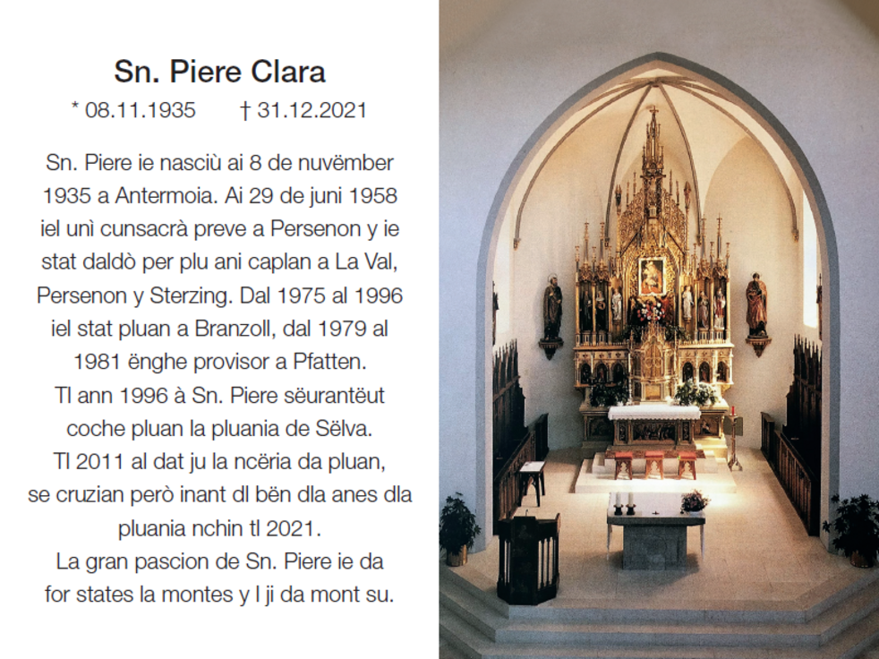 Hochwürden Clara wurde am 8. November 1935 in Untermoi geboren. Am 29. Juni 1958 wurde er in Brixen zum Priester geweiht und wirkte anschließend als Kooperator in Wengen, Brixen und Sterzing. Von 1975 bis 1996 war er als Pfarrer in Branzoll tätig, von 1979 bis 1981 zugleich auch als Provisor in Pfatten. 1996 übernahm Hochwürden Clara die Pfarre von Wolkenstein. Hier diente er 15 Jahre lang als Pfarrer. 2011 wurde er von seinem Auftrag als Pfarrer entbunden, betreute die Pfarrgemeinde Wolkenstein aber weitere zehn Jahre lang bis Anfang 2021.