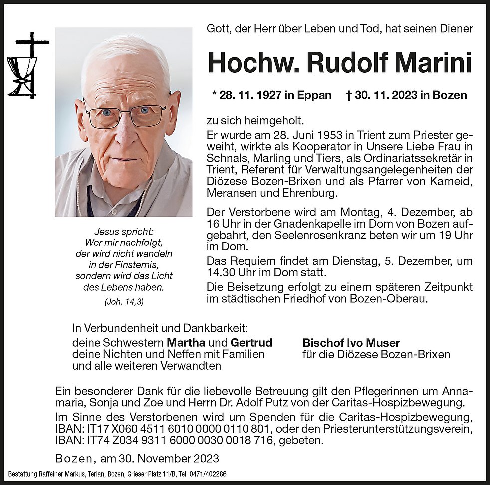 Im Sinne des Verstorbenen wird um Spenden für die Caritas Hospizbewegung IBAN: IT17 X060 4511 6010 0000 0110 801 oder den Priesterunterstützungsverein IBAN: IT74 Z034 9311 6000 0030 0018 716 gebeten.
