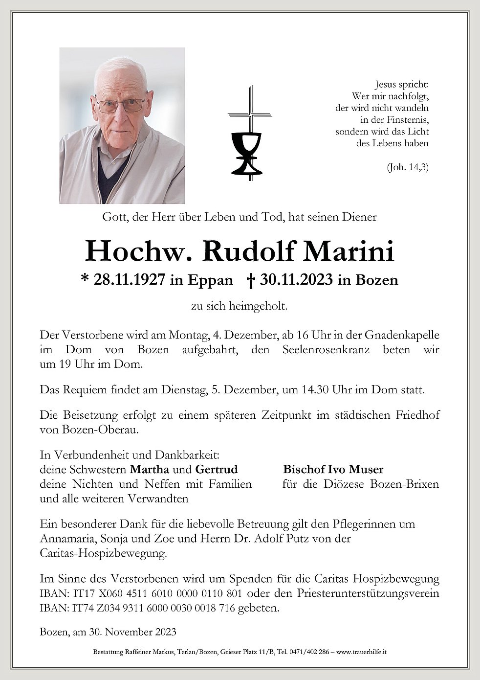 Der Verstorbene wird am Montag, 4. Dezember, ab 16 Uhr in der Gnadenkapelle im Dom von Bozen aufgebahrt, den Seelenrosenkranz beten wir um 19 Uhr im Dom.