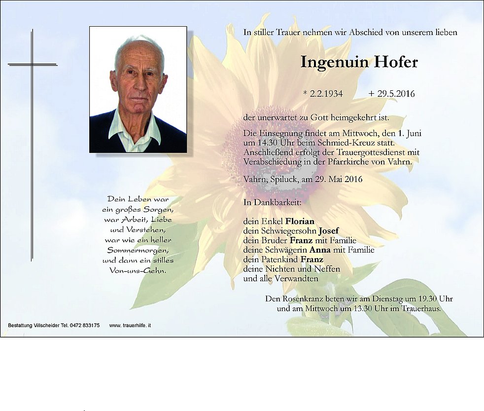 Anschließend erfolgt der Trauergottesdienst mit Verabschiedung in der Pfarrkirche von Vahrn.