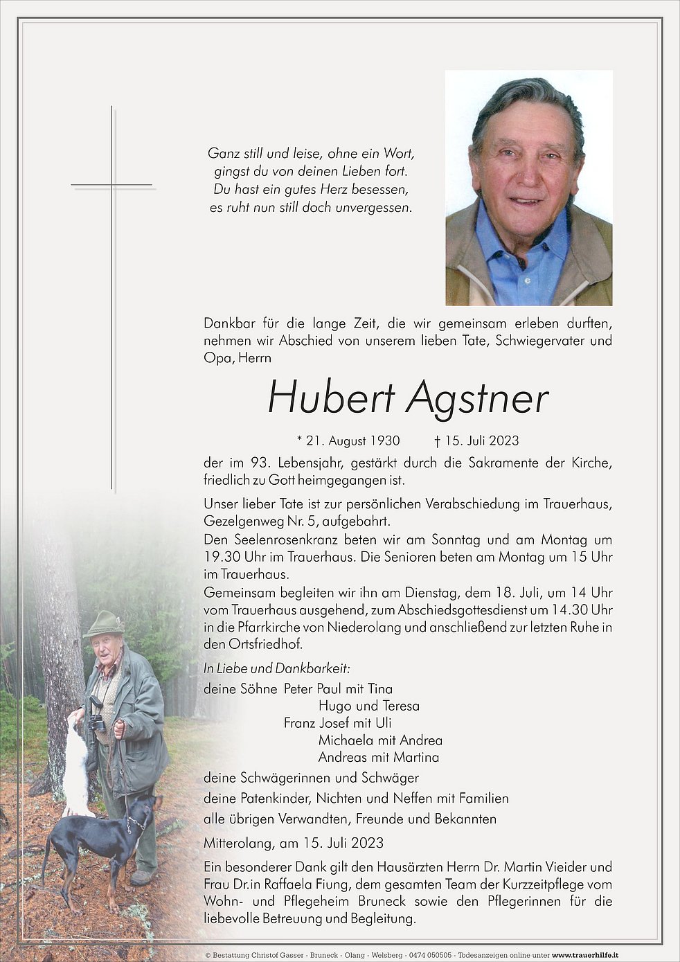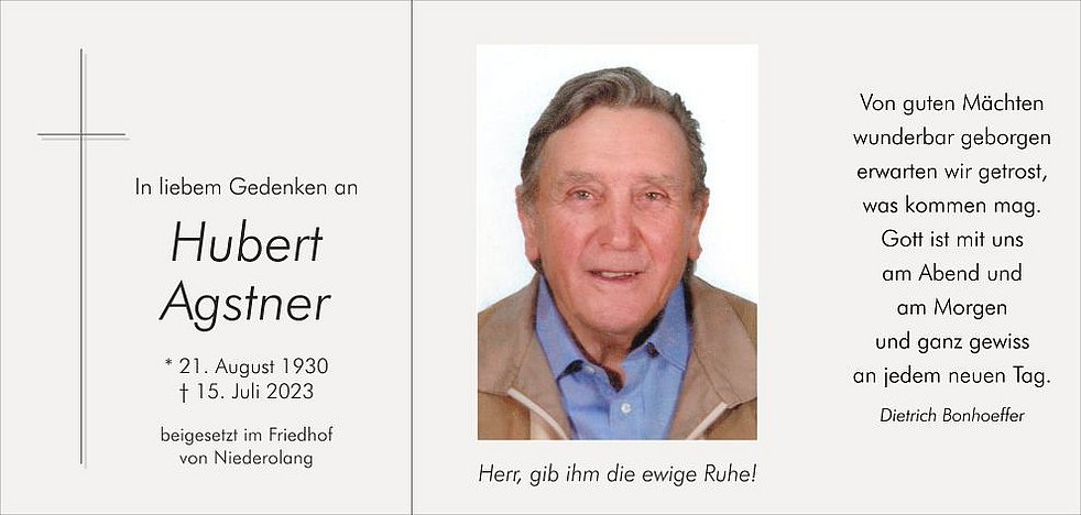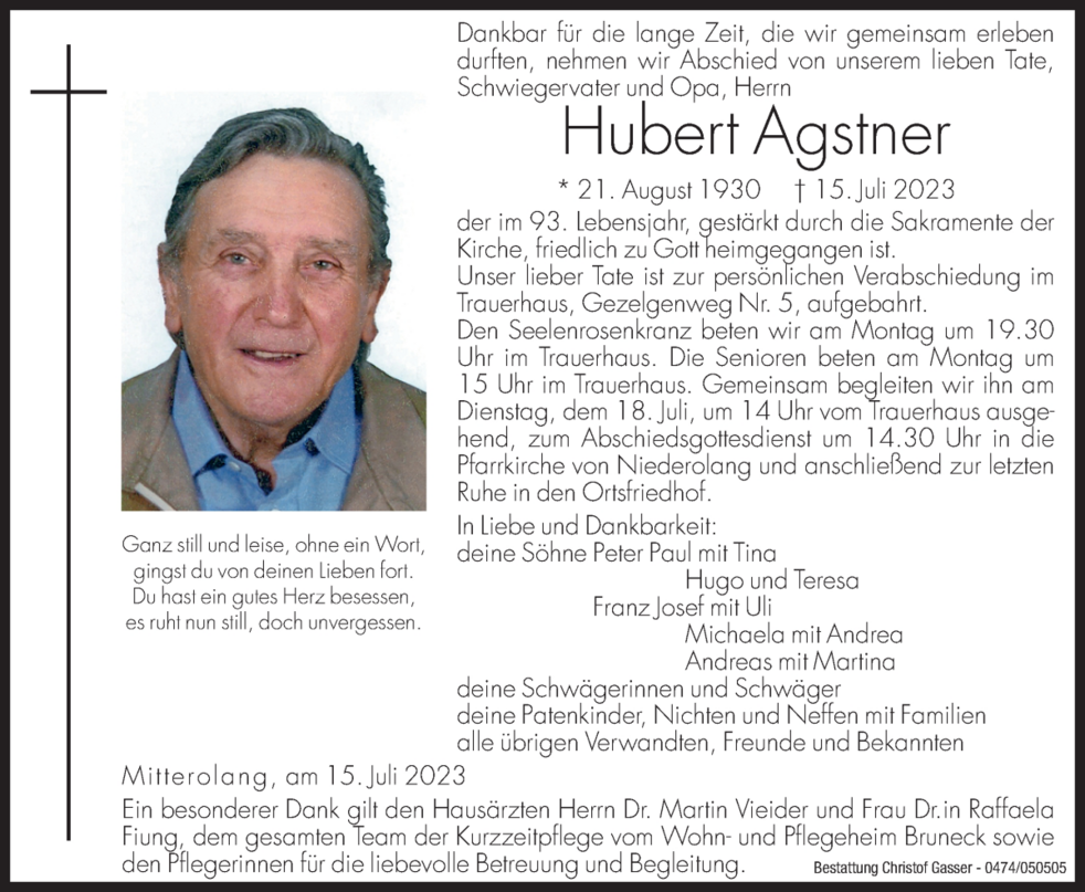 Gemeinsam begleiten wir ihn am Dienstag, dem 18. Juli, um 14 Uhr vom Trauerhaus ausgehend, zum Abschiedsgottesdienst um 14.30 Uhr in die Pfarrkirche von Niederolang und anschließend zur letzten Ruhe in den Ortsfriedhof.