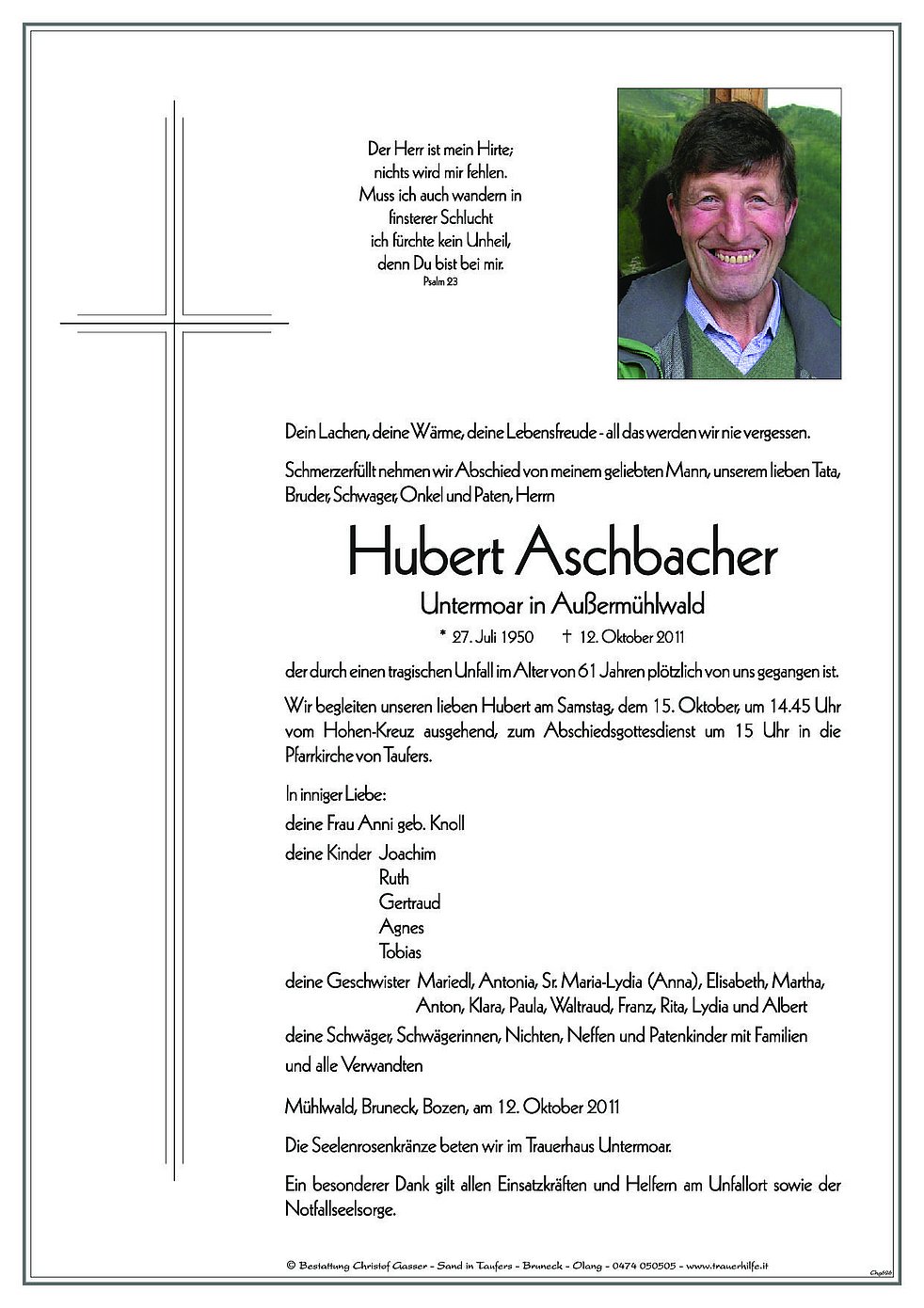 Wir begleiten unseren lieben Hubert am Samstag, dem 15. Oktober, um 14.45 Uhr vom Hohen-Kreuz ausgehend, zum Abschiedsgottesdienst um 15 Uhr in die Pfarrkirche von Taufers.