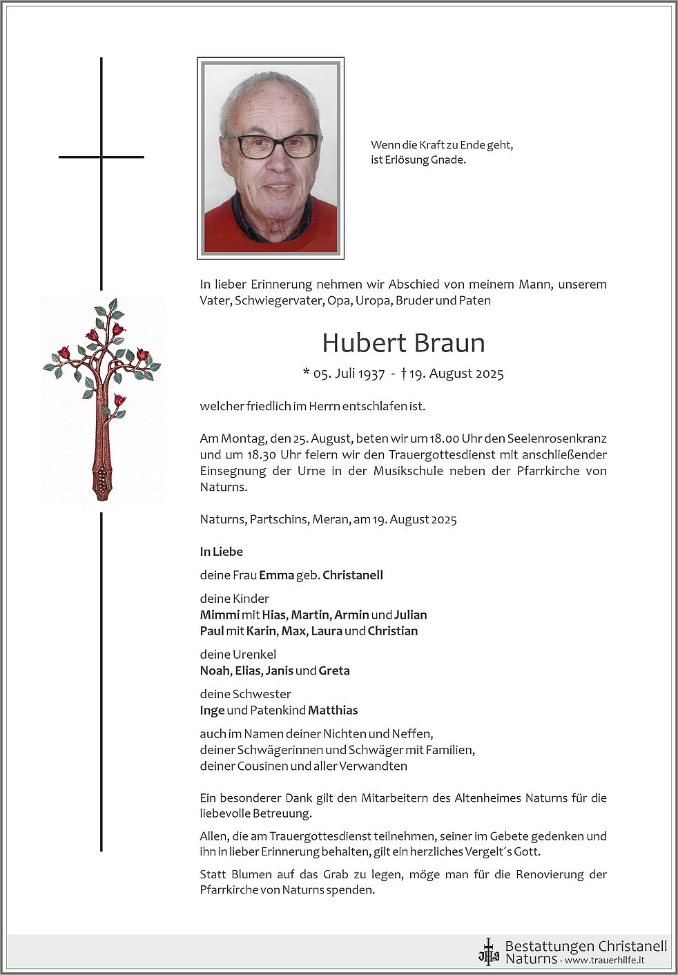 Am Montag, den 25. August, beten wir um 18.00 Uhr den Seelenrosenkranz und um 18.30 Uhr feiern wir den Trauergottesdienst mit anschließender Einsegnung der Urne in der Musikschule neben der Pfarrkirche von Naturns.