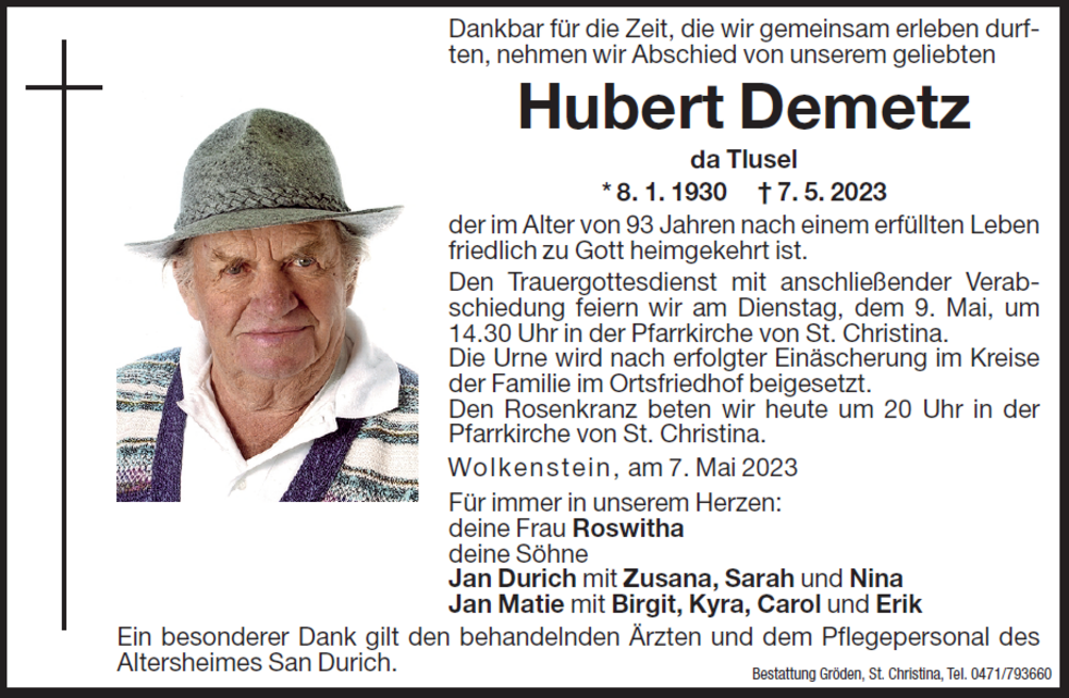 Den Trauergottesdienst mit anschließender Verabschiedung feiern wir am Dienstag, dem 09. Mai, um 14.30 Uhr in der Pfarrkirche von St. Christina. Die Urne wird nach erfolgter Einäscherung im Kreise der Familie im Ortsfriedhof beigesetzt.