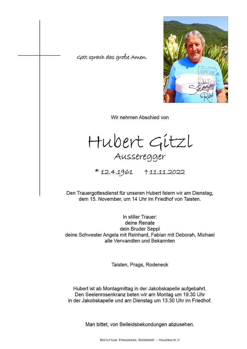 Den Trauergottesdienst für unseren Hubert feiern wir am Dienstag, dem 15. November, um 14 Uhr im Friedhof von Taisten.