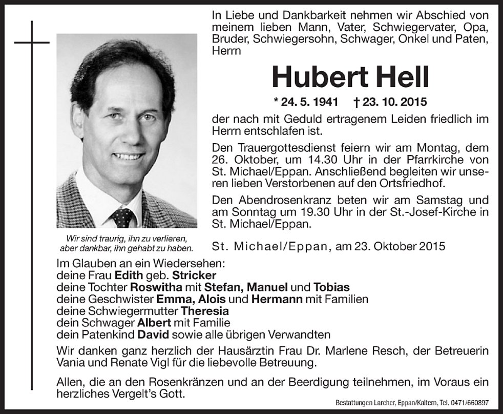 Den Trauergottesdienst feiern wir am Montag, dem 26. Oktober, um 14.30 Uhr in der Pfarrkirche von St. Michael/Eppan. Anschließend begleiten wir unseren lieben Verstorbenen auf den Ortsfriedhof.