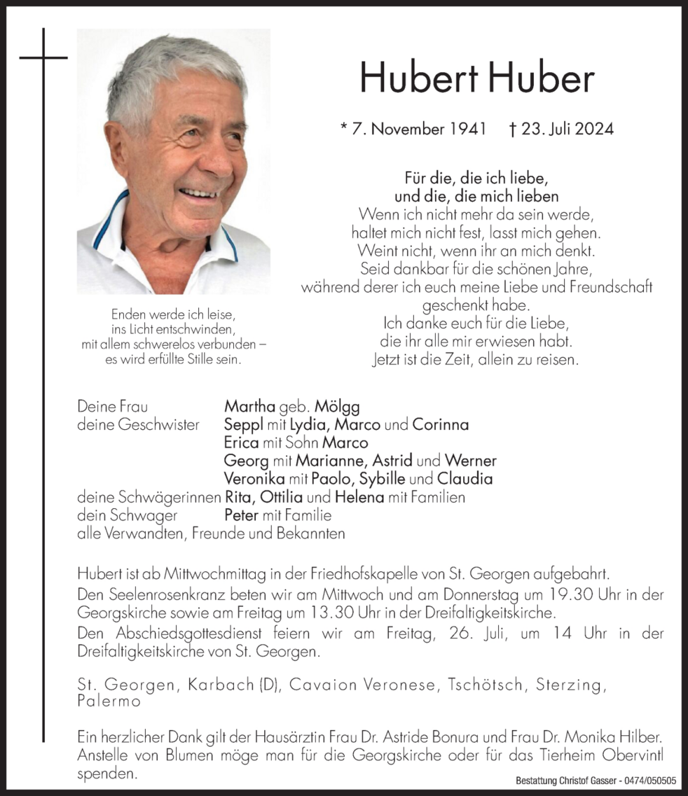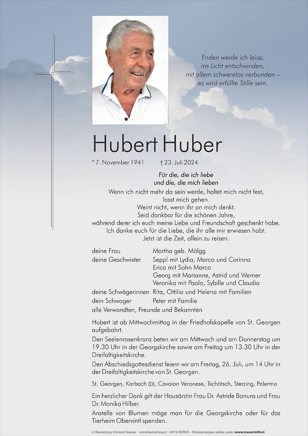 Hubert ist ab Mittwochmittag in der Friedhofskapelle von St. Georgen aufgebahrt. Den Seelenrosenkranz beten wir am Mittwoch und am Donnerstag um 19.30 Uhr in der Georgskirche sowie am Freitag um 13.30 Uhr in der Dreifaltigkeitskirche.