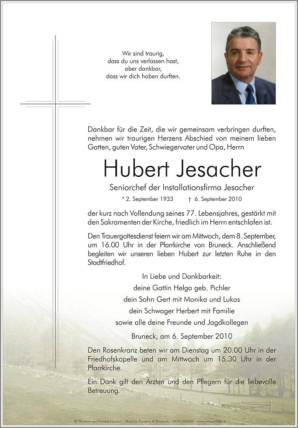 Den Trauergottesdienst feiern wir am Mittwoch, dem 8. September, um 16.00 Uhr in der Pfarrkirche von Bruneck. Anschließend begleiten wir unseren lieben Hubert zur letzten Ruhe in den Stadtfriedhof.