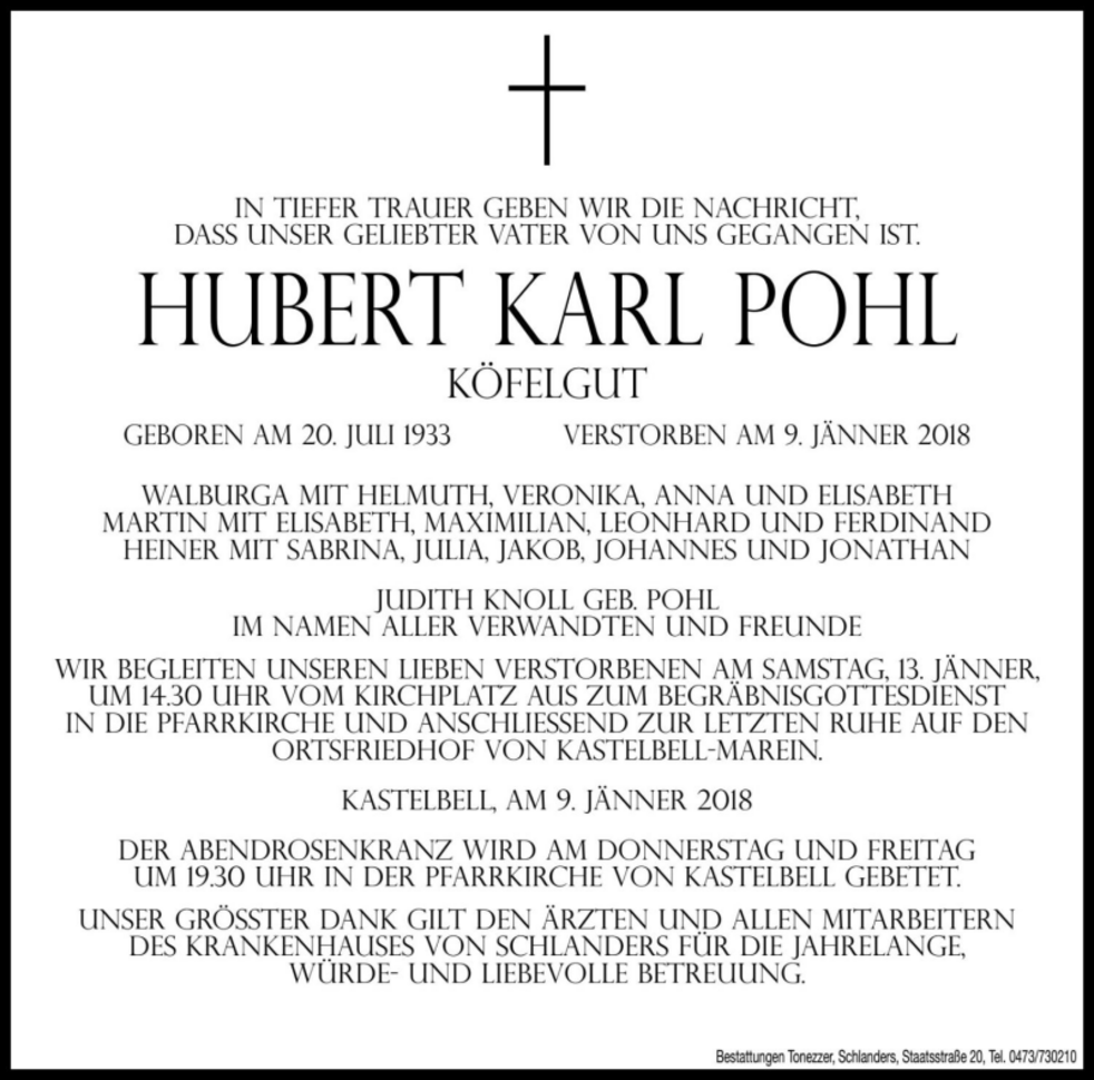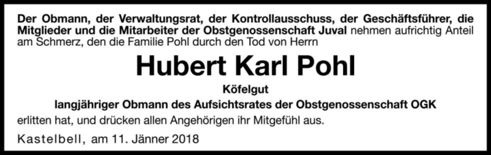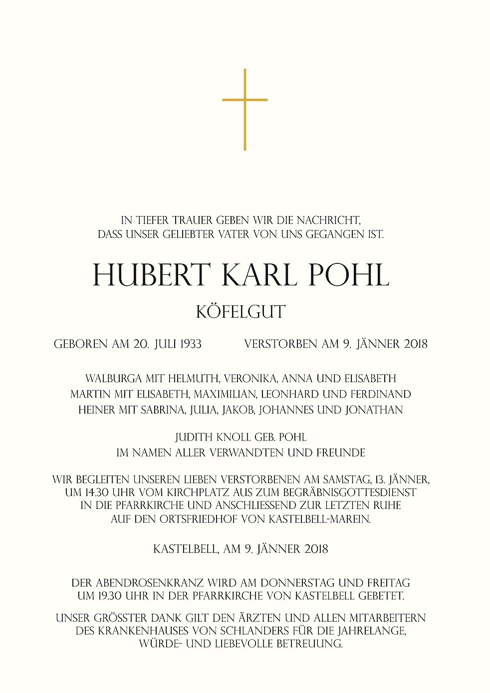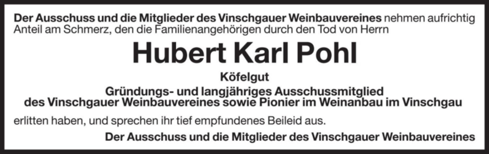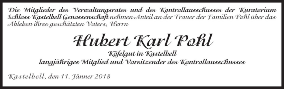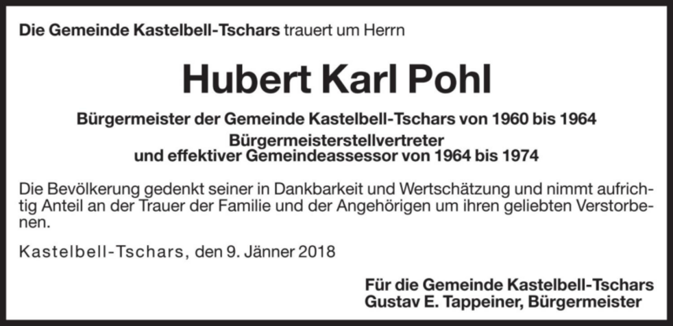 Wir begleiten unseren lieben Verstorbenen am Samstag, 13. Jänner, um 14.30 Uhr vom Kirchplatz aus zum Begräbnisgottesdienst in die Pfarrkirche und anschließend zur letzten Ruhe auf den Ortsfriedhof von Kastelbell-Marein.