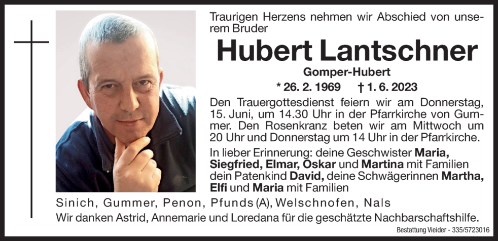 Den Trauergottesdienst feiern wir am Donnerstag, 15. Juni, um 14.30 Uhr in der Pfarrkirche von Gummer. Den Rosenkranz beten wir am Mittwoch um 20 Uhr und am Donnerstag um 14 Uhr in der Pfarrkirche.