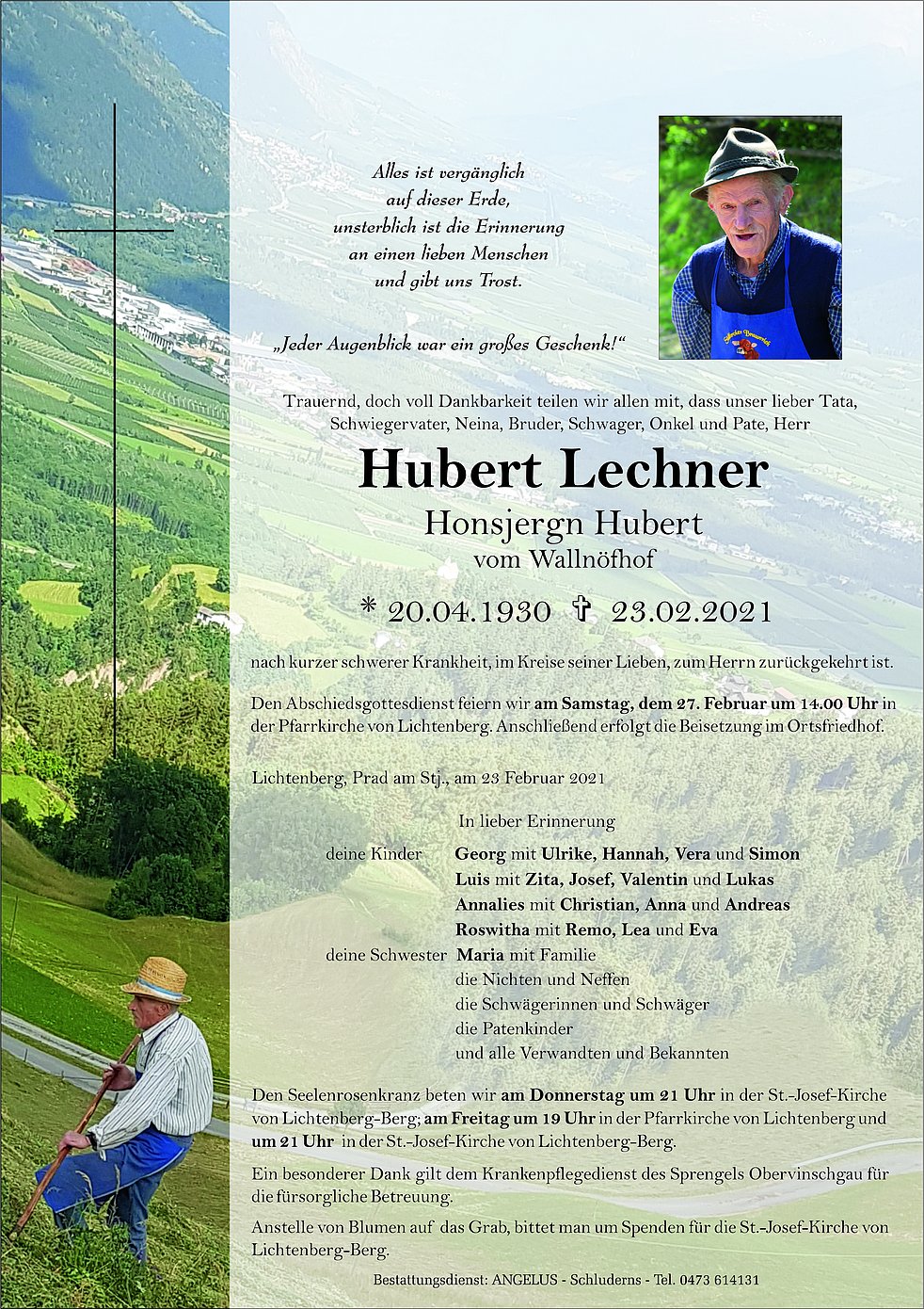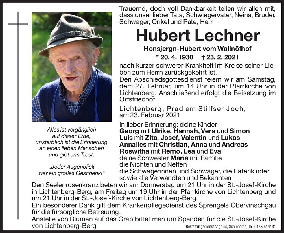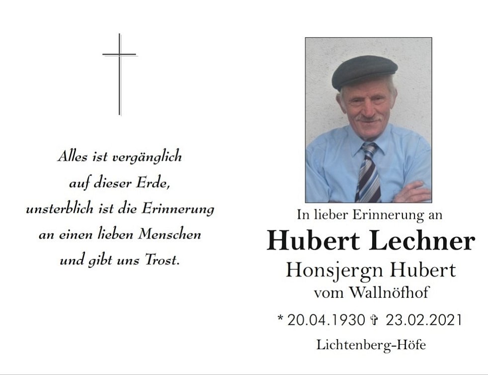 Den Abschiedsgottesdienst feiern wir am Samstag, dem 27. Februar um 14.00 Uhr in der Pfarrkirche von Lichtenberg. Anschließend erfolgt die Beisetzung im Ortsfriedhof.