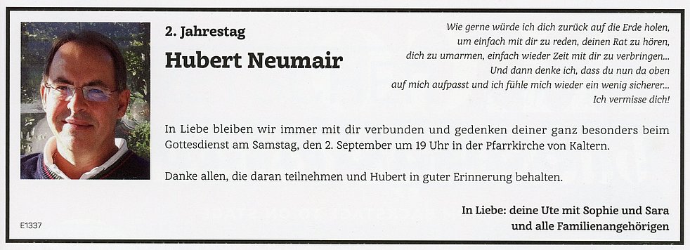 Den Abschiedsgottesdienst feiern wir am Montag, dem 6. September um 17 Uhr in der Pfarrkirche von Kaltern. Anschließend begleiten wir unseren lieben Hubert auf den Ortsfriedhof.