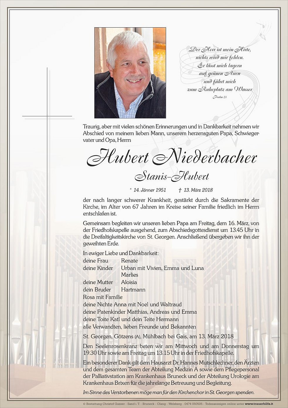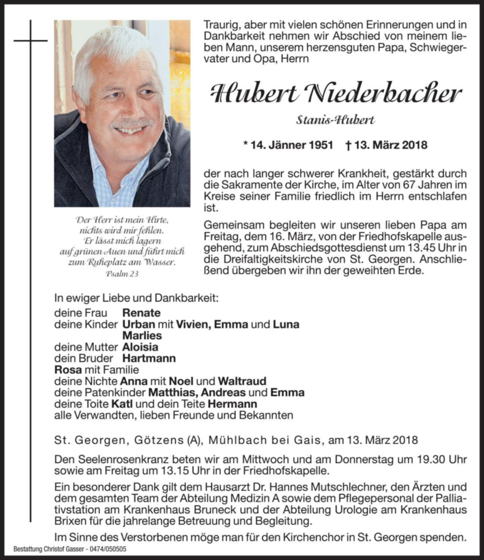 Gemeinsam begleiten wir unseren lieben Papa am Freitag, dem 16. März, von der Friedhofskapelle ausgehend, zum Abschiedsgottesdienst um 13.45 Uhr in die Dreifaltigkeitskirche von St. Georgen. Anschließend übergeben wir ihn der geweihten Erde.