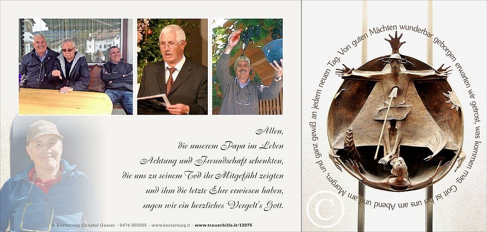 Ein besonderer Dank gilt dem Hausarzt Dr. Hannes Mutschlechner, den Ärzten und dem gesamten Team der Abteilung Medizin A sowie dem Pflegepersonal der Palliativstation am Krankenhaus Bruneck und der Abteilung Urologie am Krankenhaus Brixen für die jahrelange Betreuung und Begleitung.