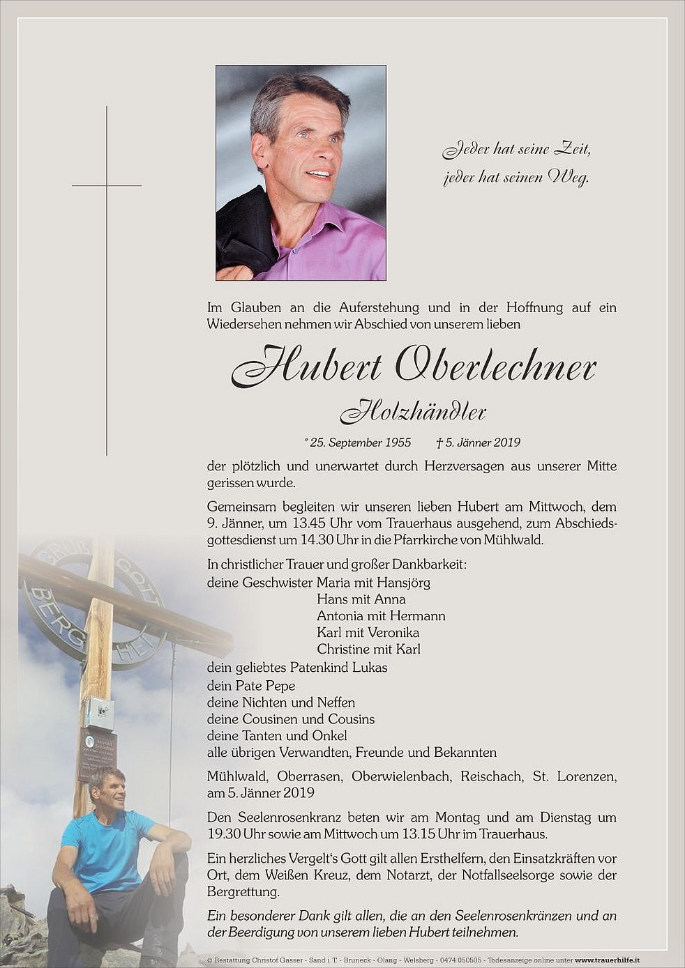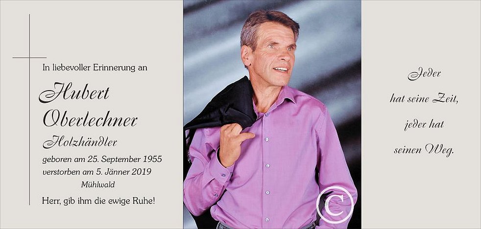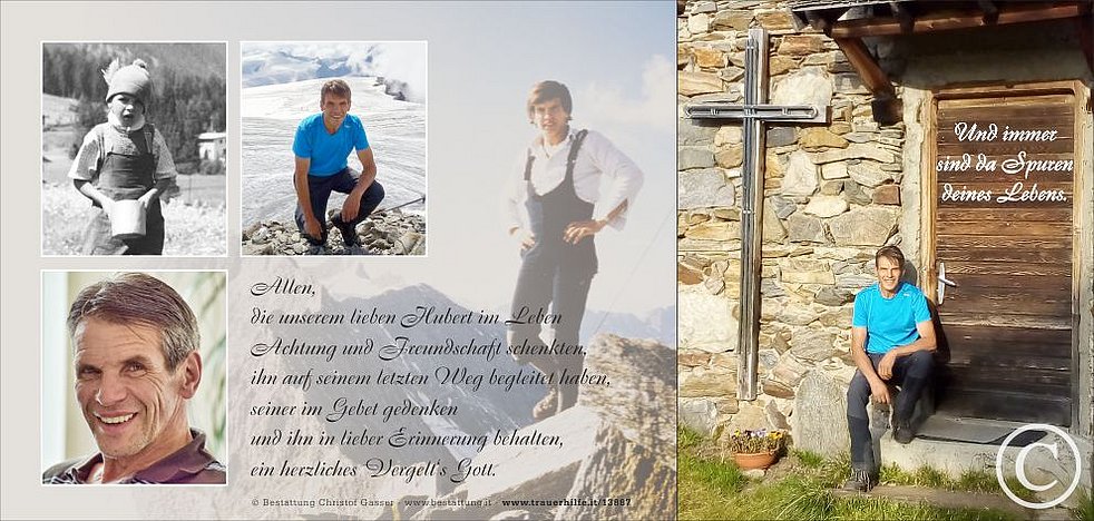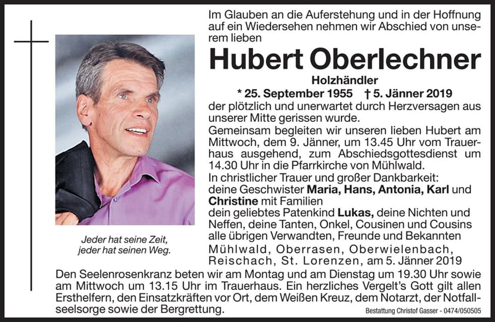 Gemeinsam begleiten wir unseren lieben Hubert am Mittwoch, dem 9. Jänner, um 13.45 Uhr vom Trauerhaus ausgehend, zum Abschiedsgottesdienst um 14.30 Uhr in die Pfarrkirche von Mühlwald.