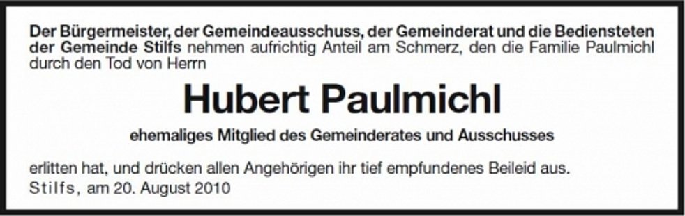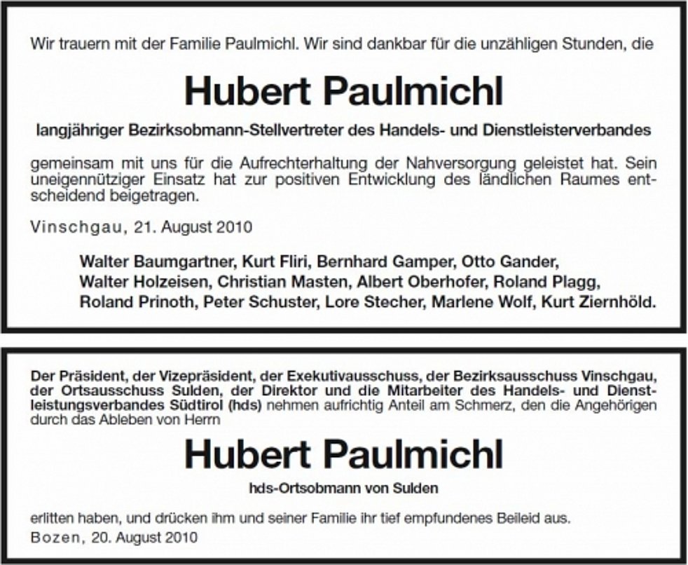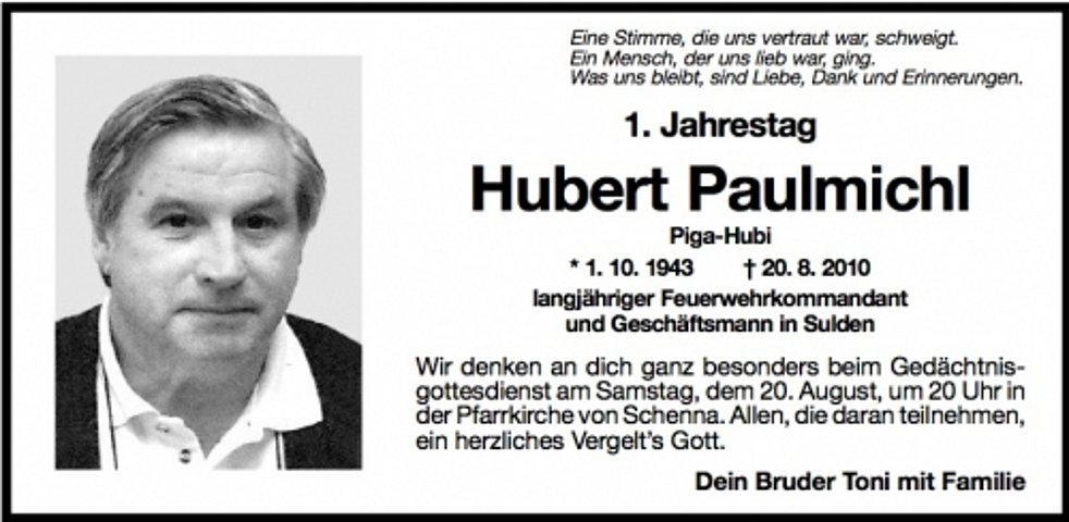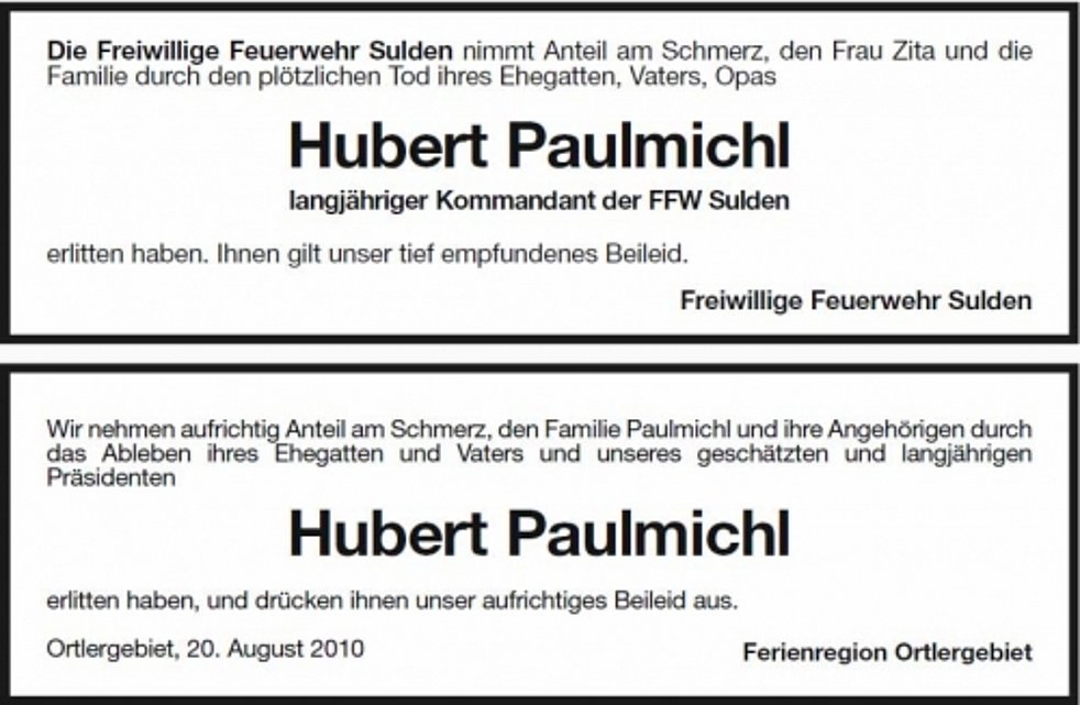 Als ich im Herbst auf ein Wanderwochenende im Vinschgau war, erfuhren wir vom Ableben Herrn Paulmichls. Unser tiefstes Mitgegühl möchten wir hiermit zum Ausdruck bringen.