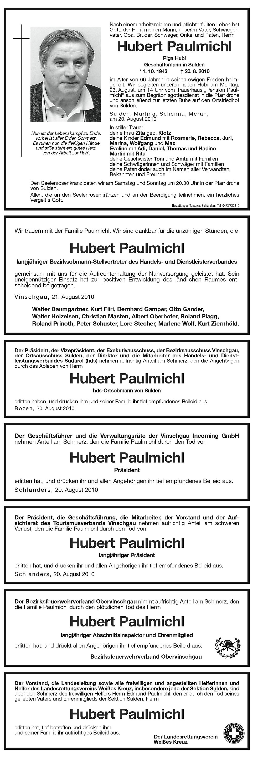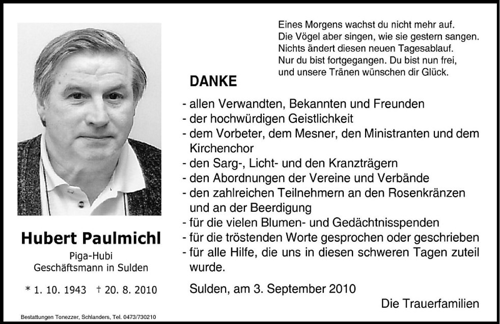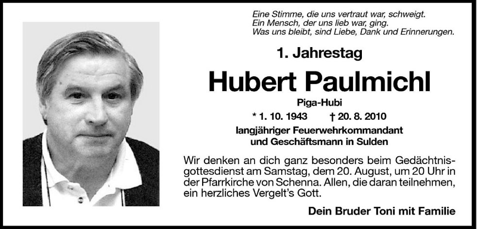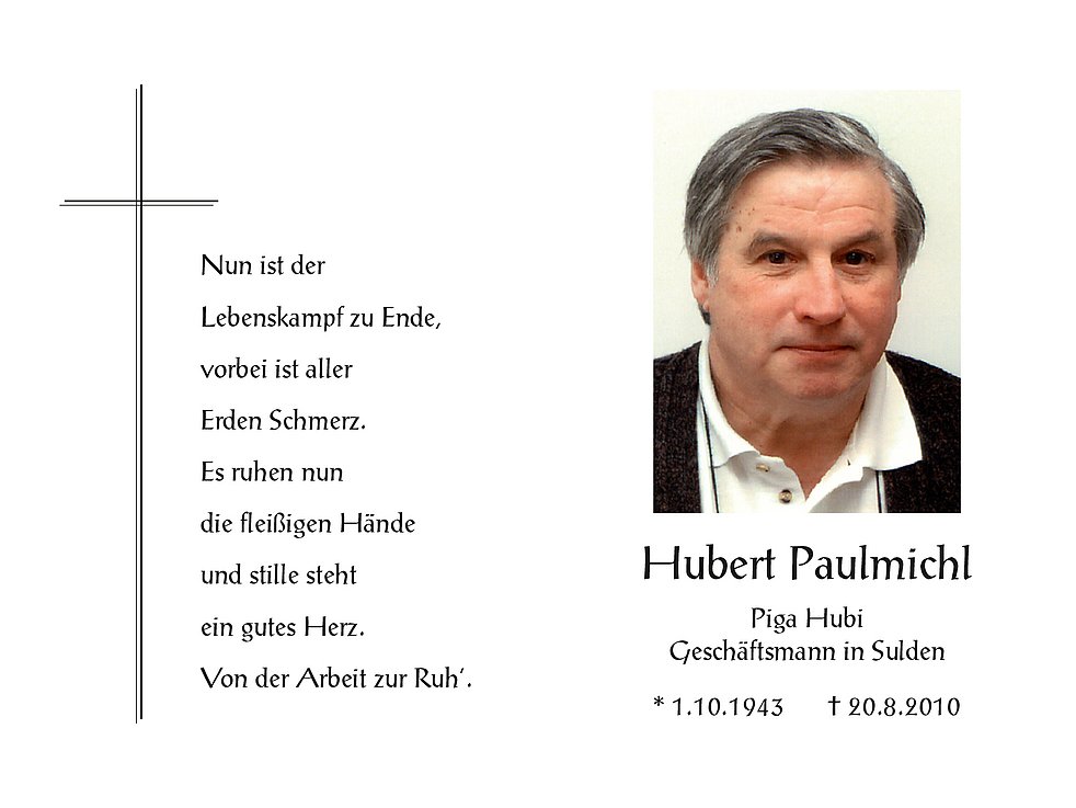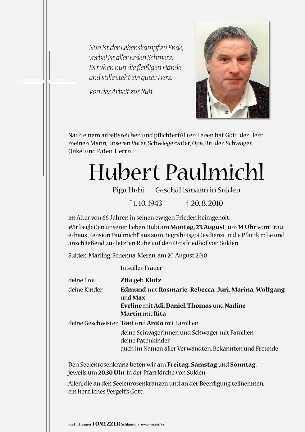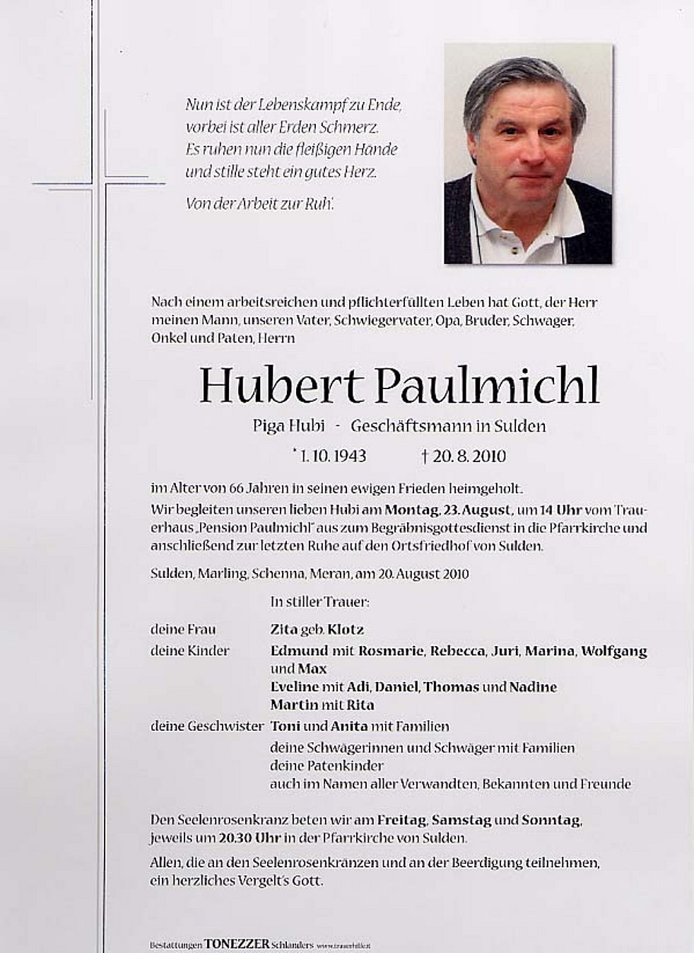 Wir begleiten unseren lieben Hubi am Montag, 23. August, um 14 Uhr vom Trauerhaus „Pension Paulmichl“ aus zum Begräbnisgottesdienst in die Pfarrkirche und anschließend zur letzten Ruhe auf den Ortsfriedhof von Sulden.
