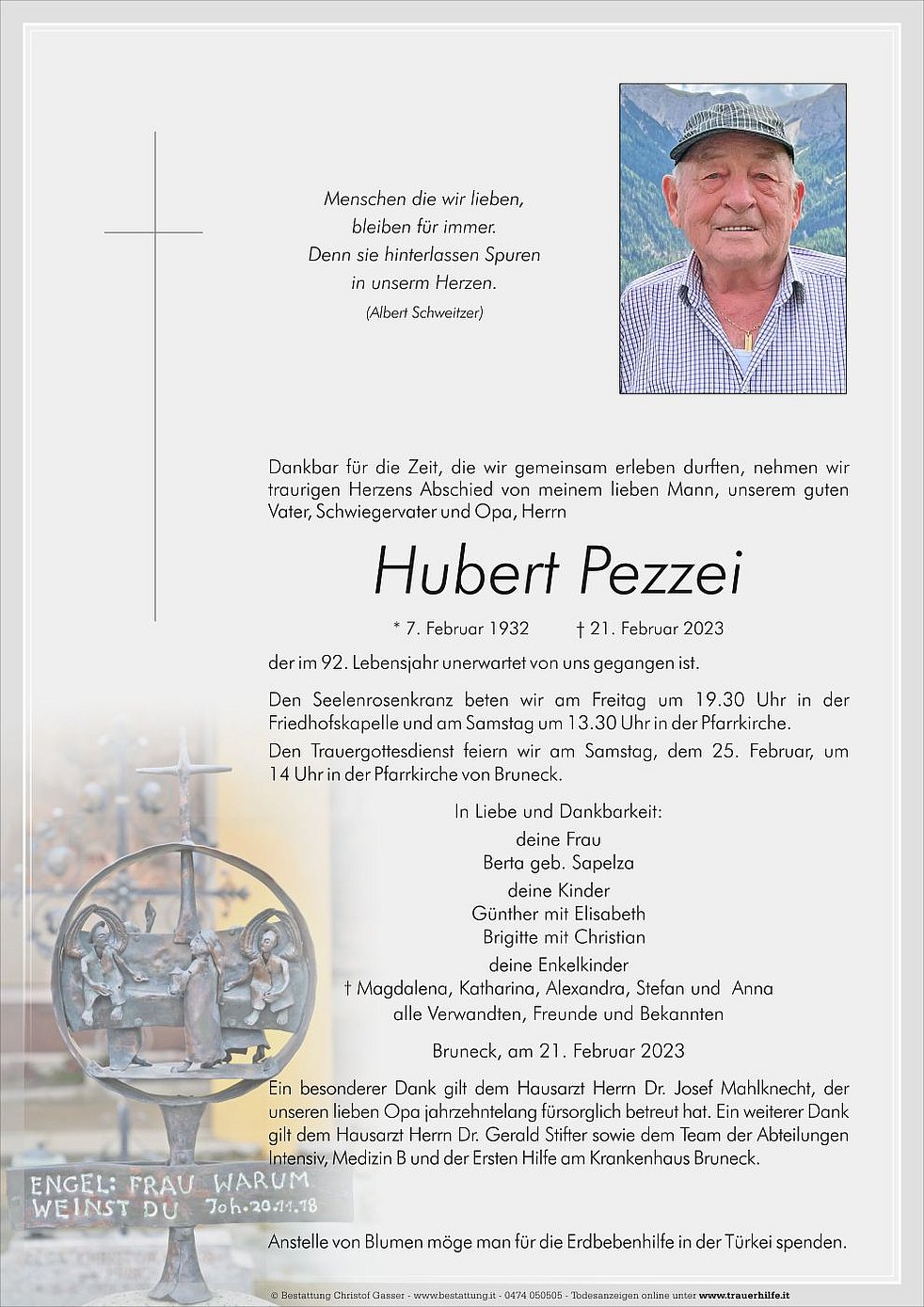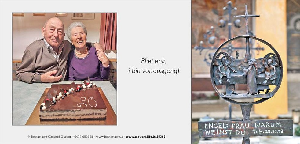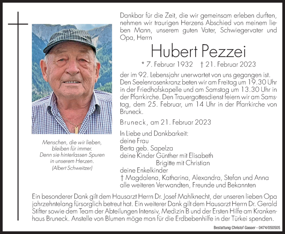 Ein besonderer Dank gilt dem Hausarzt Herrn Dr. Josef Mahlknecht, der unseren lieben Opa jahrzehntelang fürsorglich betreut hat. Ein weiterer Dank gilt dem Hausarzt Herrn Dr. Gerald Stifter sowie dem Team der Abteilungen Intensiv, Medizin B und der Ersten Hilfe am Krankenhaus Bruneck.