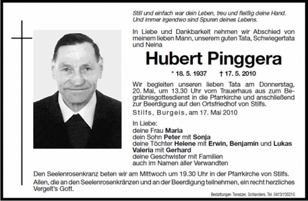 Wir begleiten unseren lieben Tata am Donnerstag, 20. Mai, um 13.30 Uhr vom Trauerhaus aus zum Begräbnisgottesdienst in die Pfarrkirche und anschließend zur Beerdigung auf den Ortsfriedhof von Stilfs.
