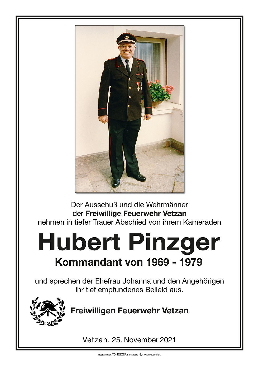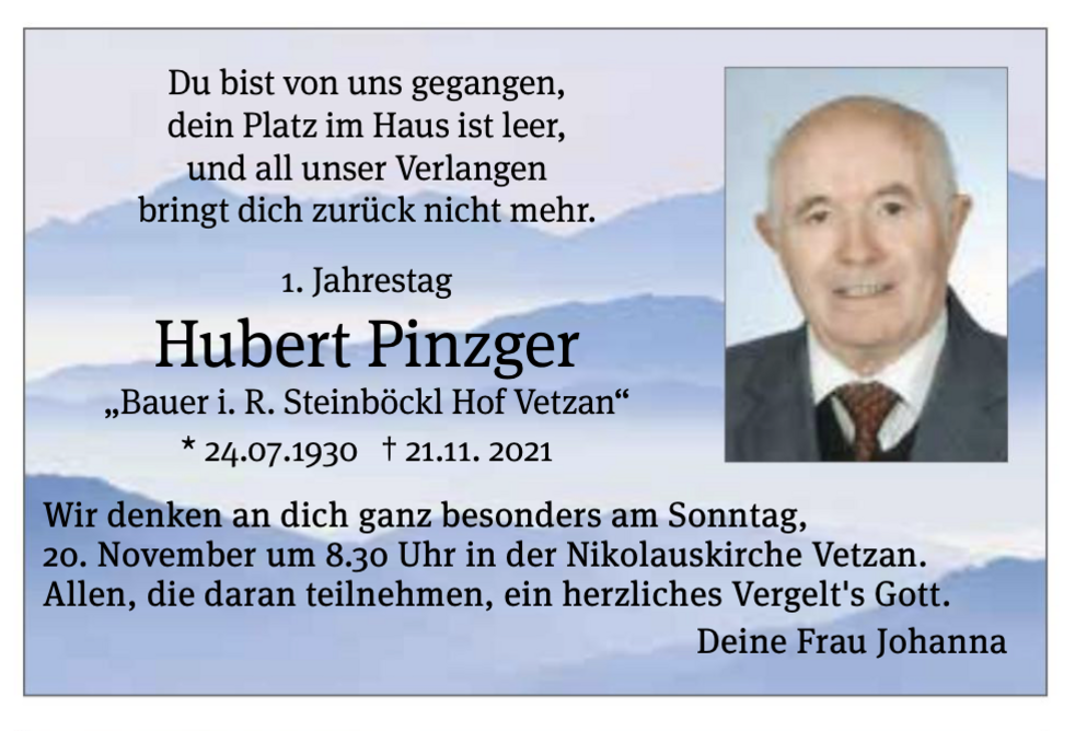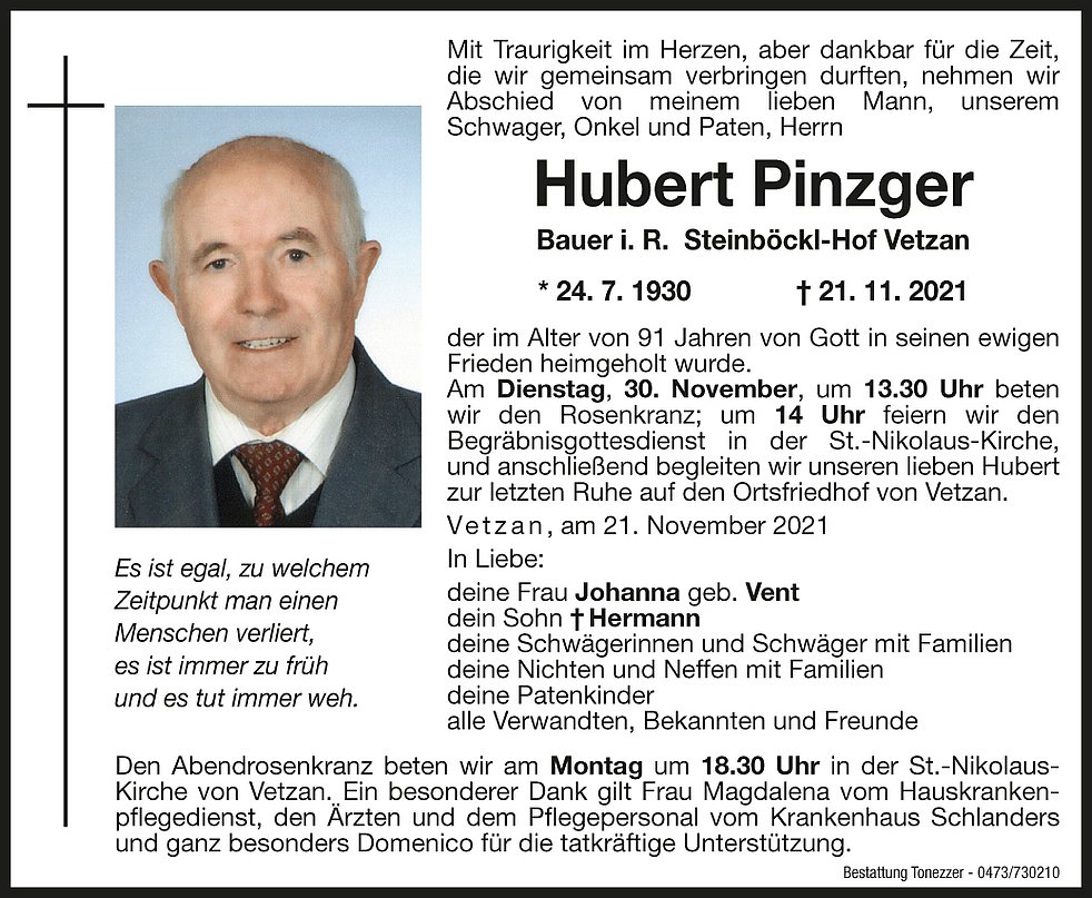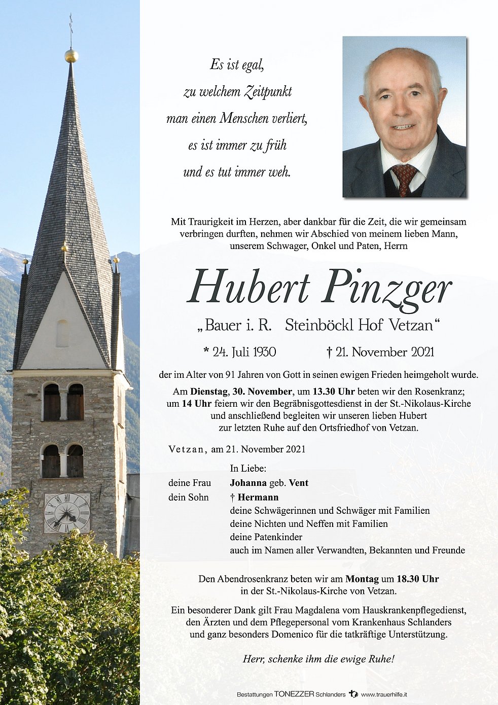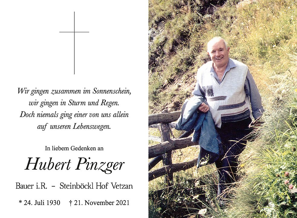 Am Dienstag, 30. November, um 13.30 Uhr beten wir den Rosenkranz; um 14 Uhr feiern wir den Begräbnisgottesdienst in der St.-Nikolaus-Kirche und anschließend begleiten wir unseren lieben Hubert zur letzten Ruhe auf den Ortsfriedhof von Vetzan.