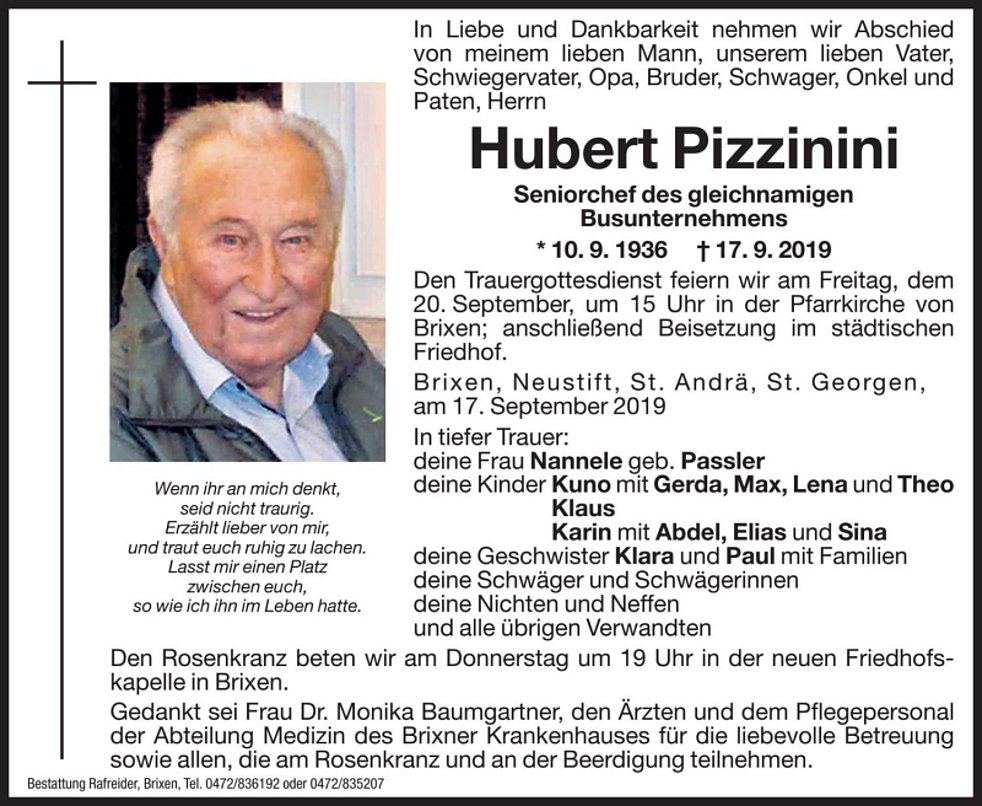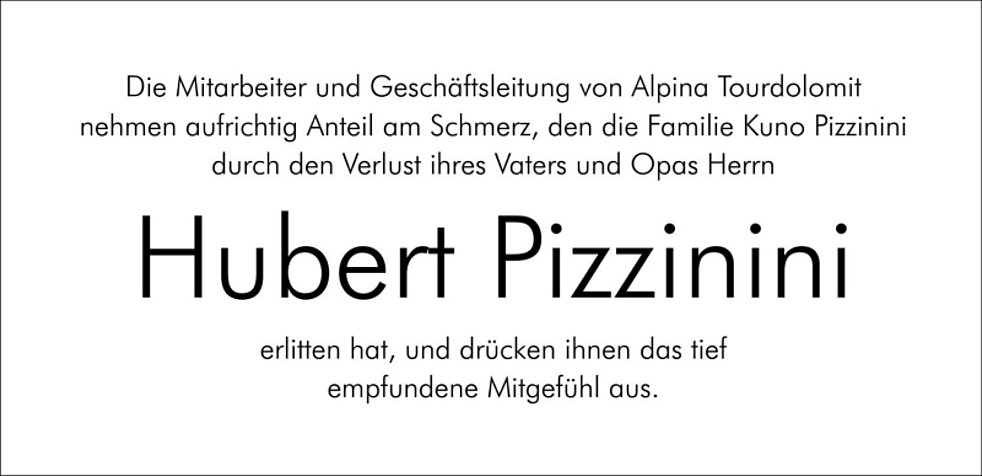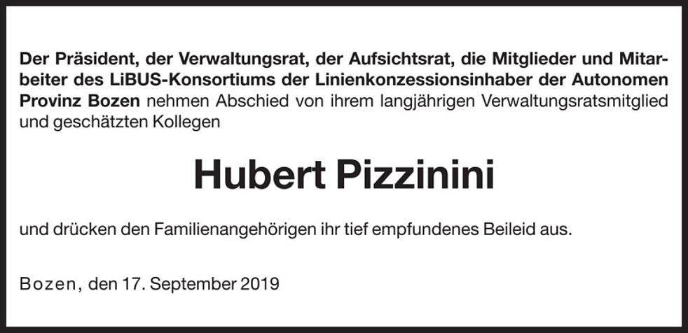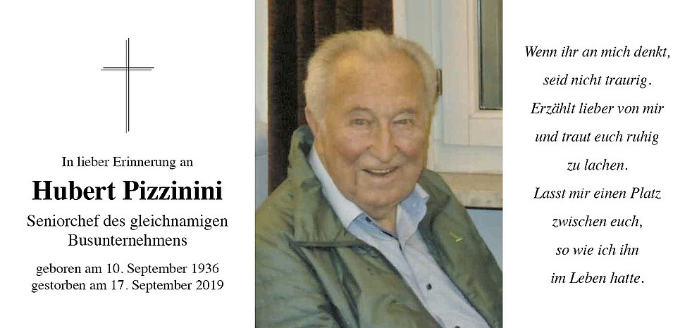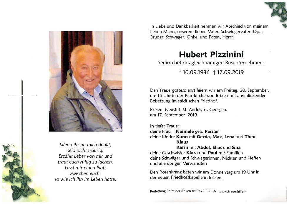 Den Trauergottesdienst feiern wir am Freitag, 20. September, um 15 Uhr in der Pfarrkirche von Brixen mit anschließender Beisetzung im städtischen Friedhof.