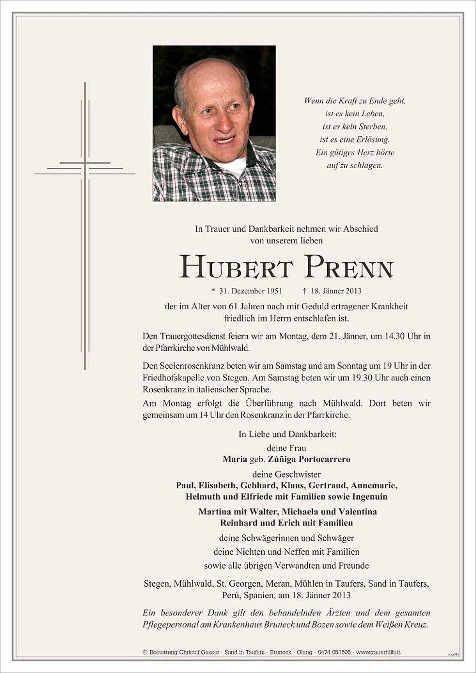 Ein besonderer Dank gilt den behandelnden Ärzten und dem gesamten Pflegepersonal am Krankenhaus Bruneck und Bozen sowie dem Weißen Kreuz.