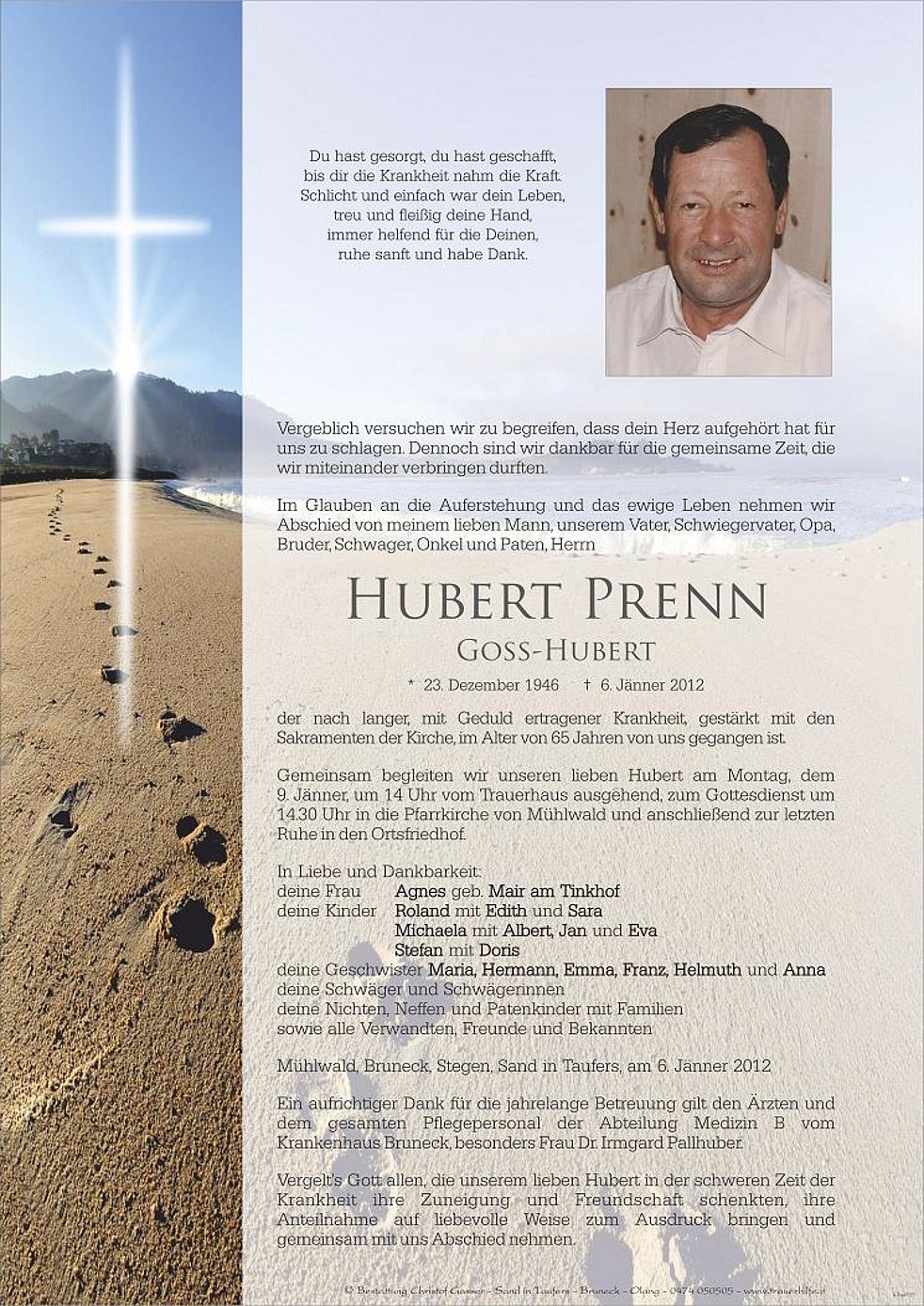 9. Jänner, um 14 Uhr vom Trauerhaus ausgehend, zum Gottesdienst um 14.30 Uhr in die Pfarrkirche von Mühlwald und anschließend zur letzten Ruhe in den Ortsfriedhof.