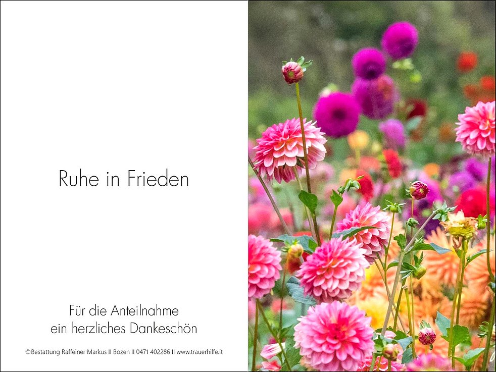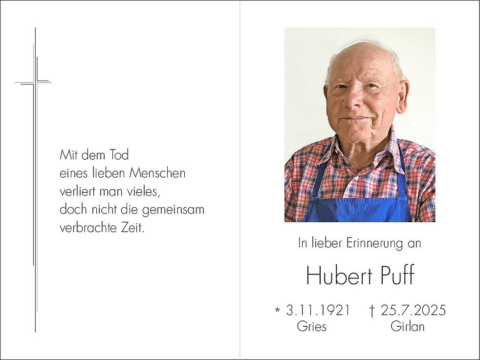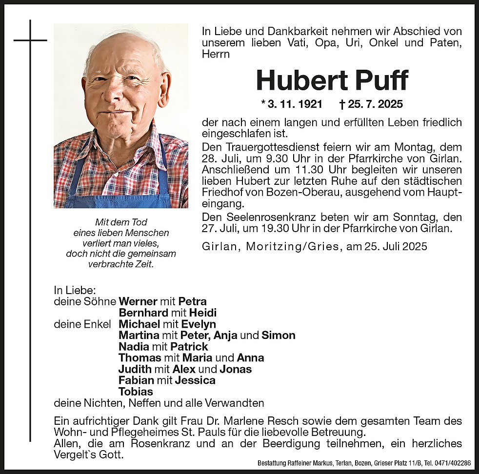Den Trauergottesdienst feiern wir am Montag, dem 28. Juli, um 9.30 Uhr in der Pfarrkirche von Girlan. Anschließend um 11.30 Uhr begleiten wir unseren lieben Hubert zur letzten Ruhe auf den städtischen Friedhof von Bozen-Oberau, ausgehend vom Haupteingang.