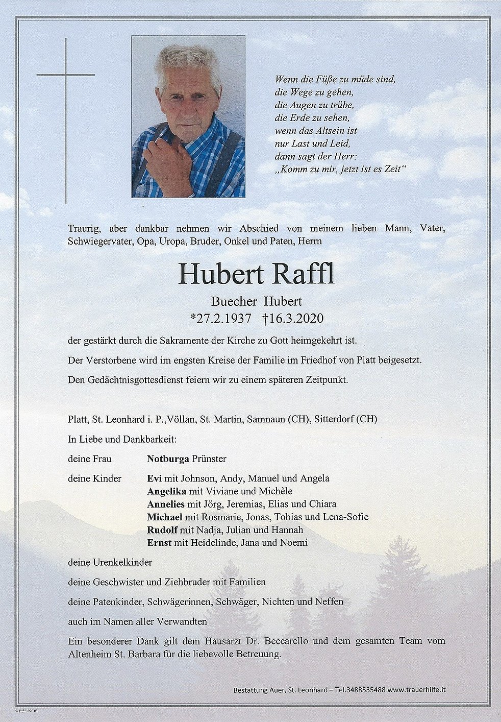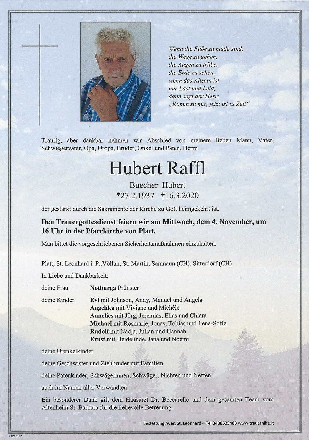 Den Trauergottesdienst feiern wir am Mittwoch, 4. November, um 16 Uhr in der Pfarrkirche von Platt.