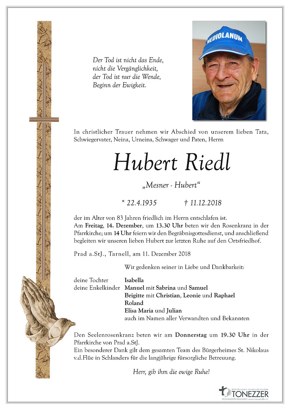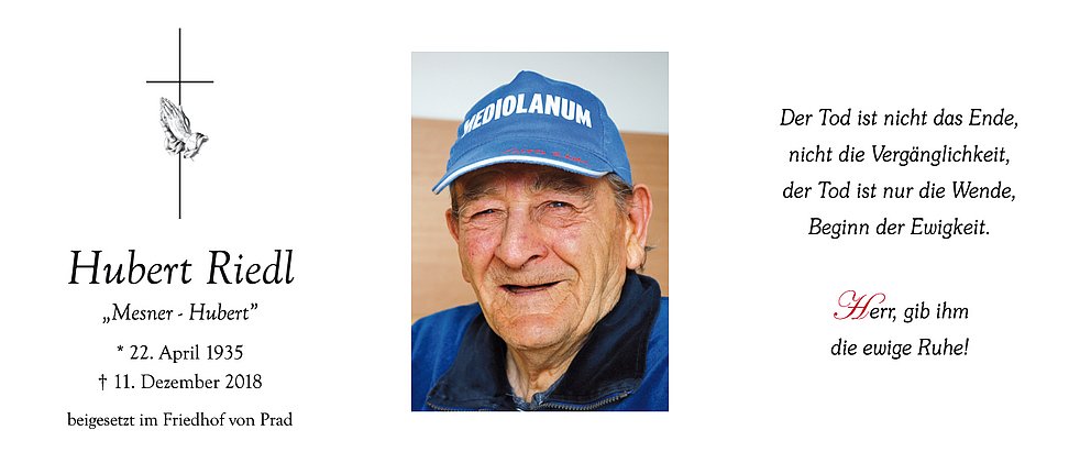 Am Freitag, 14. Dezember, um 13.30 Uhr beten wir den Rosenkranz in der Pfarrkirche; um 14 Uhr feiern wir den Begräbnisgottesdienst, und anschließend begleiten wir unseren lieben Hubert zur letzten Ruhe auf den Ortsfriedhof.