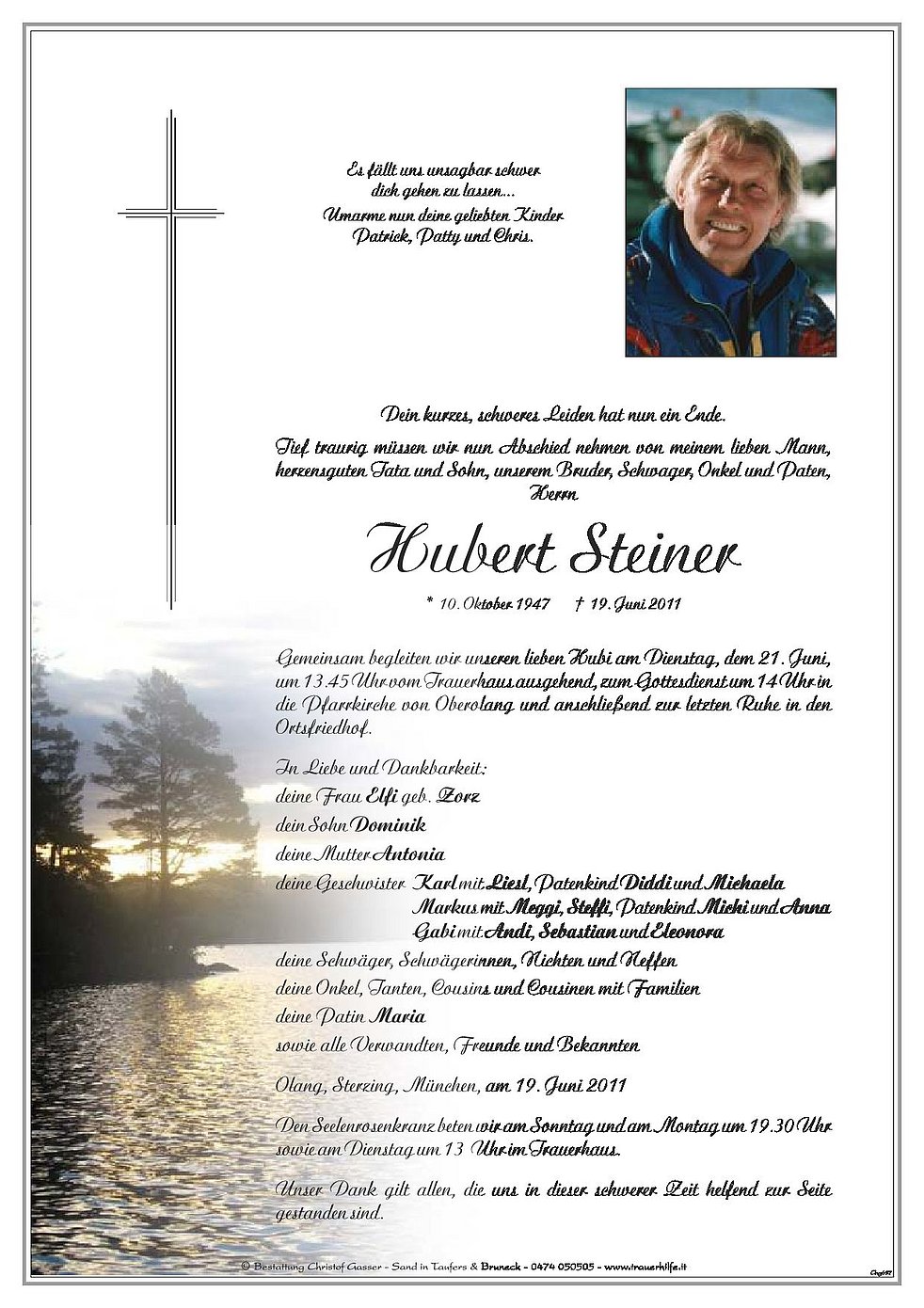 Gemeinsam begleiten wir unseren lieben Hubi am Dienstag, dem 21. Juni, um 13.45 Uhr vom Trauerhaus ausgehend, zum Gottesdienst um 14 Uhr in die Pfarrkirche von Oberolang und anschließend zur letzten Ruhe in den Ortsfriedhof.