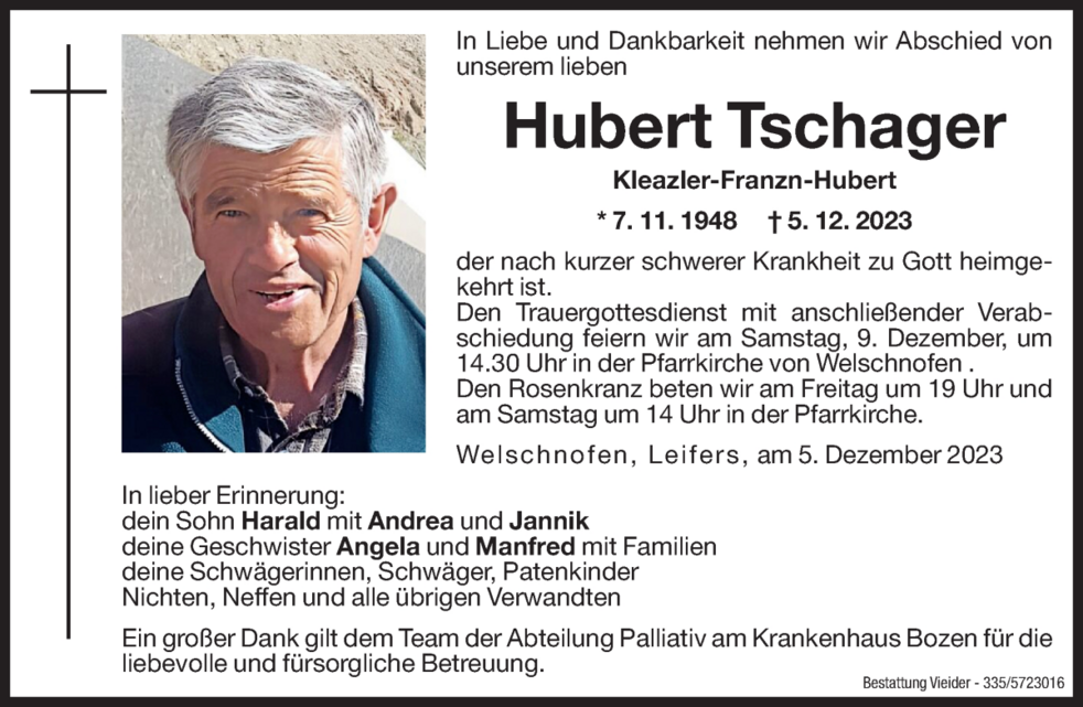 Den Trauergottesdienst mit anschließender Verabschiedung feiern wir am Samstag, 9. Dezember, um 14.30 Uhr in der Pfarrkirche von Welschnofen .