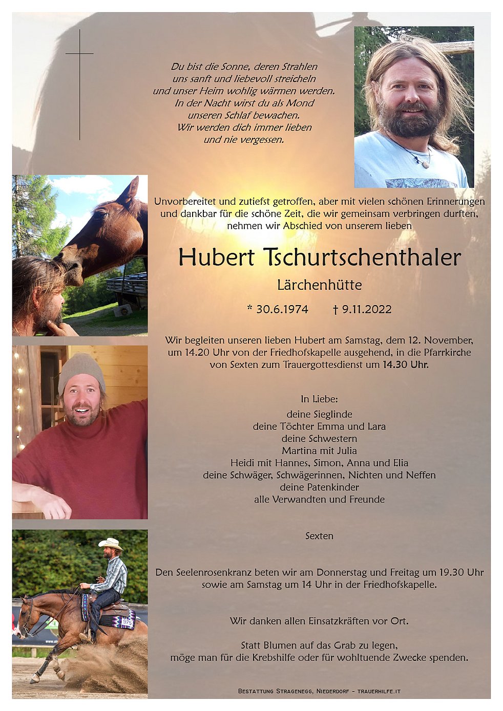 Wir begleiten unseren lieben Hubert am Samstag, dem 12. November, um 14.20 Uhr von der Friedhofskapelle ausgehend, in die Pfarrkirche von Sexten zum Trauergottesdienst um 14.30 Uhr.