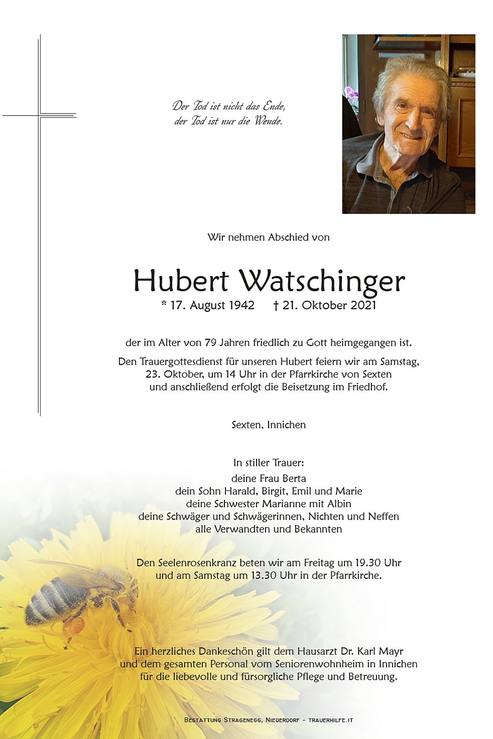 Den Trauergottesdienst für unseren Hubert feiern wir am Samstag, 23. Oktober, um 14 Uhr in der Pfarrkirche von Sexten und anschließend erfolgt die Beisetzung im Friedhof.