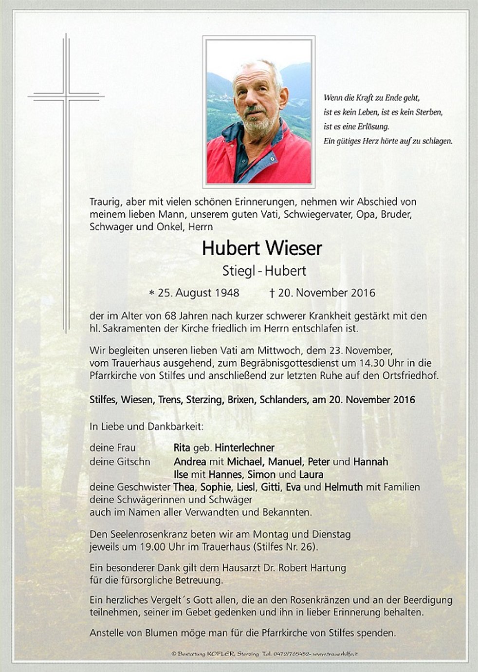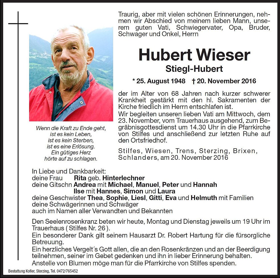 Wir begleiten unseren lieben Vati am Mittwoch, dem 23. November, vom Trauerhaus ausgehend, zum Begräbnisgottesdienst um 14.30 Uhr in die Pfarrkirche von Stilfes und anschließend zur letzten Ruhe auf den Ortsfriedhof.