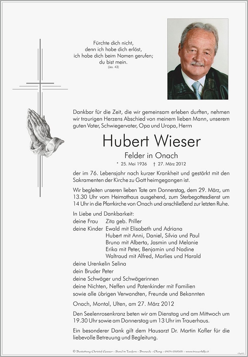 Wir begleiten unseren lieben Tate am Donnerstag, dem 29. März, um 13.30 Uhr vom Heimathaus ausgehend, zum Sterbegottesdienst um 14 Uhr in die Pfarrkirche von Onach und anschließend zur letzten Ruhe.