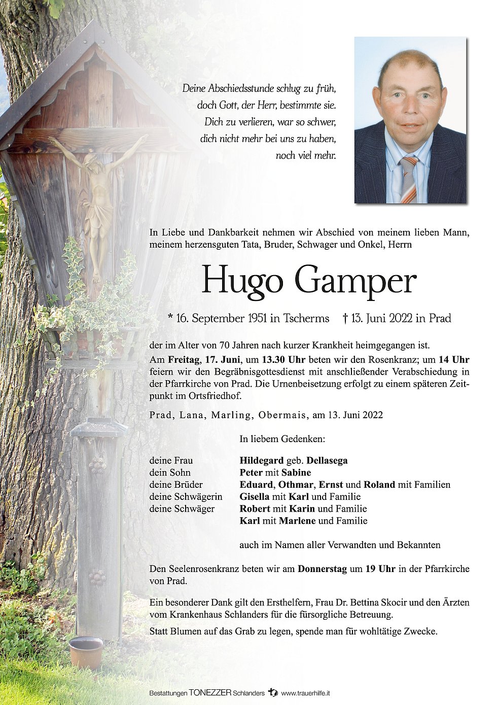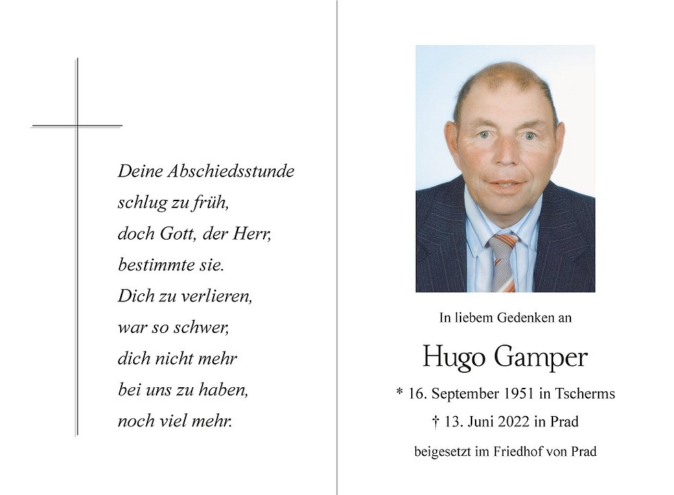 Am Freitag, 17. Juni, um 13.30 Uhr beten wir den Rosenkranz; um 14 Uhr feiern wir den Begräbnisgottesdienst mit anschließender Verabschiedung in der Pfarrkirche von Prad.