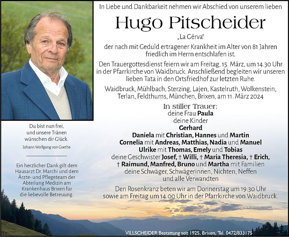 Trauerfeier: 15.03. - 14:30 Uhr Waidbruck