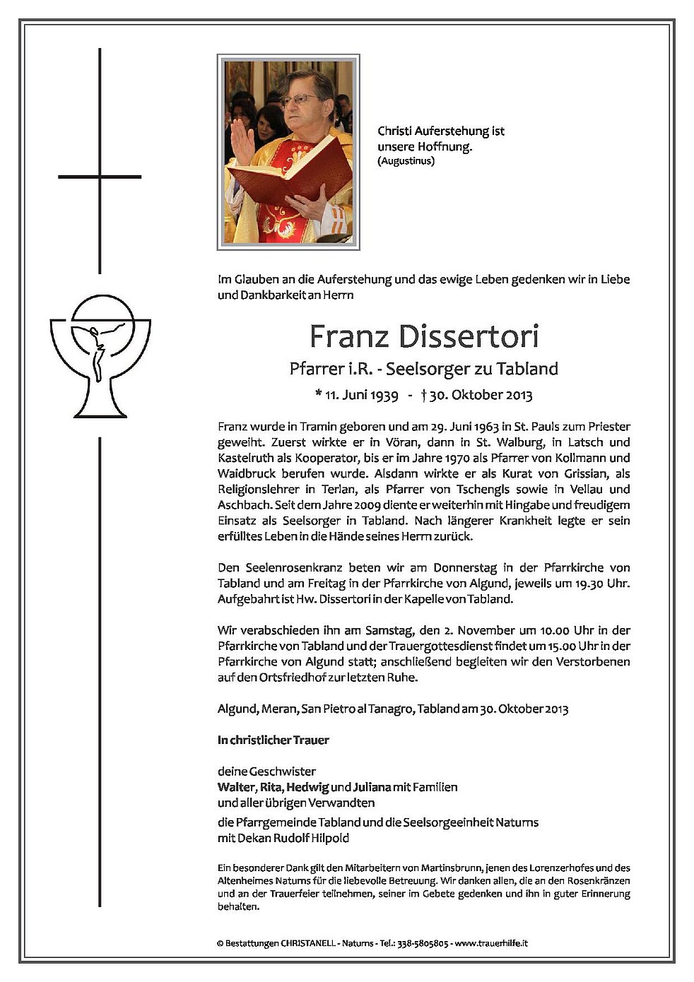 Franz wurde in Tramin geboren und am 29. Juni 1963 in St. Pauls zum Priester geweiht. Zuerst wirkte er in Vöran, dann in St. Walburg, in Latsch und Kastelruth als Kooperator, bis er im Jahre 1970 als Pfarrer von Kollmann und Waidbruck berufen wurde. Alsdann wirkte er als Kurat von Grissian, als Religionslehrer in Terlan, als Pfarrer von Tschengls sowie in Vellau und Aschbach. Seit dem Jahre 2009 diente er weiterhin mit Hingabe und freudigem Einsatz als Seelsorger in Tabland. Nach längerer Krankheit legte er sein erfülltes Leben in die Hände seines Herrn zurück.