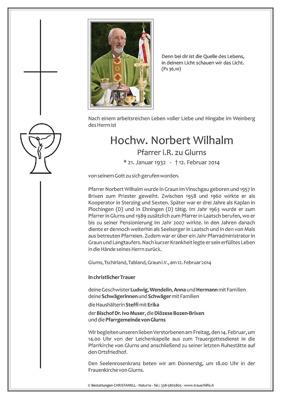 Pfarrer Norbert Wilhalm wurde in Graun im Vinschgau geboren und 1957 in Brixen zum Priester geweiht. Zwischen 1958 und 1960 wirkte er als Kooperator in Sterzing und Sexten. Später war er drei Jahre als Kaplan in Plochingen (D) und in Ehningen (D) tätig. Im Jahr 1963 wurde er zum Pfarrer in Glurns und 1989 zusätzlich zum Pfarrer in Laatsch berufen, wo er bis zu seiner Pensionierung im Jahr 2007 wirkte. In den Jahren danach diente er dennoch weiterhin als Seelsorger in Laatsch und in den von Mals aus betreuten Pfarreien. Zudem war er über ein Jahr Pfarradministrator in Graun und Langtaufers. Nach kurzer Krankheit legte er sein erfülltes Leben in die Hände seines Herrn zurück.
