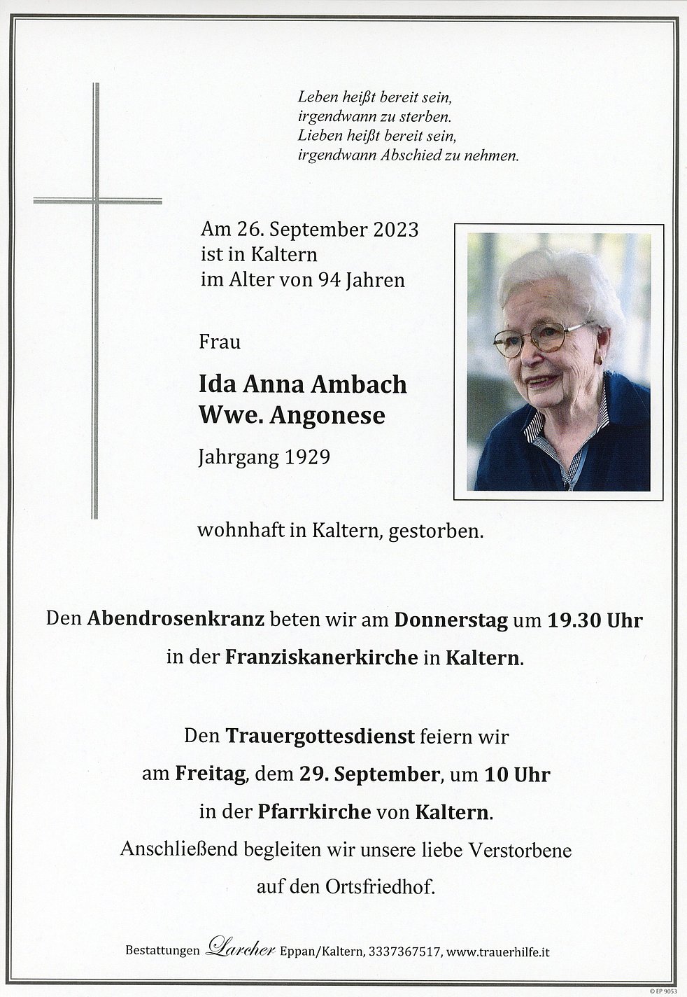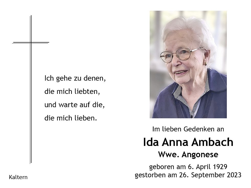 Den Trauergottesdienst feiern wir am Freitag, dem 29. September um 10 Uhr in der Pfarrkirche von Kaltern. Anschließend begleiten wir unsere liebe Verstorbene auf den Ortsfriedhof.