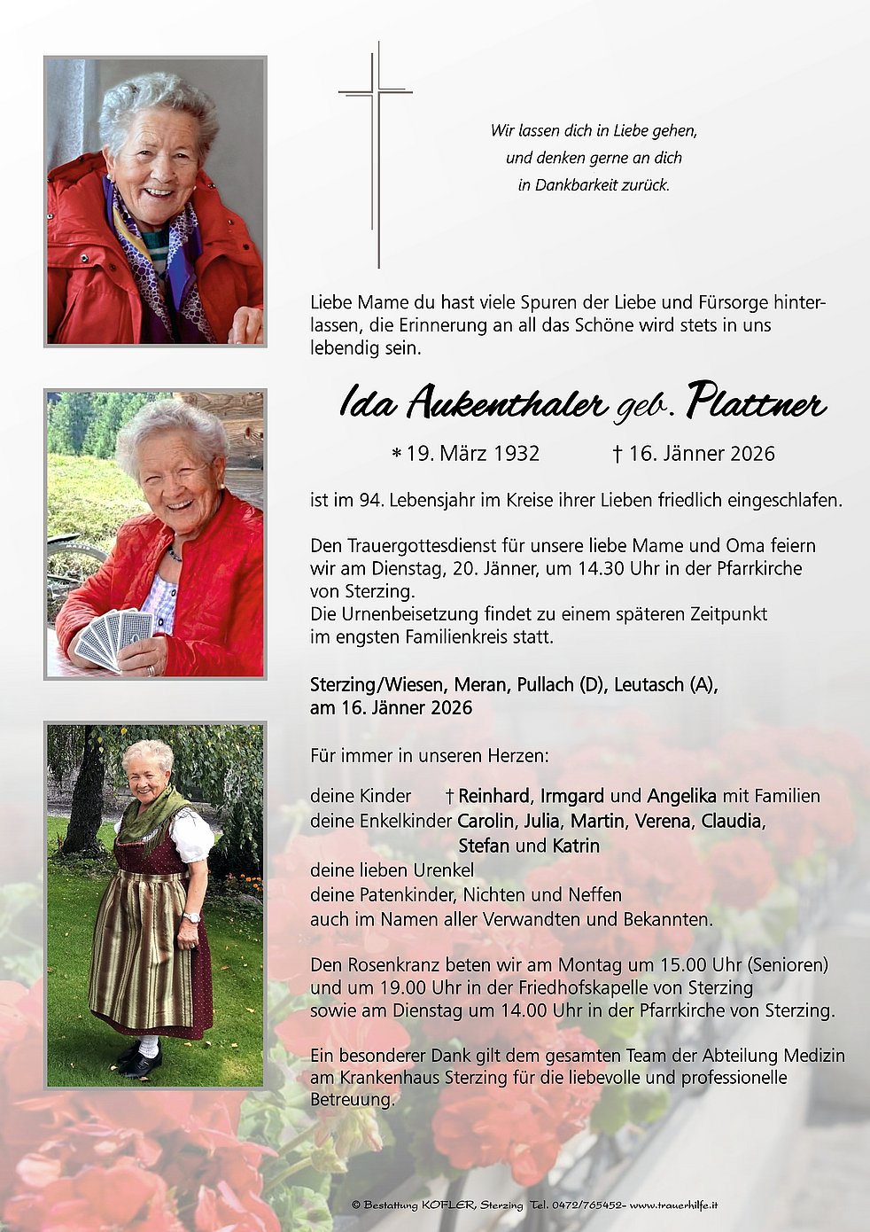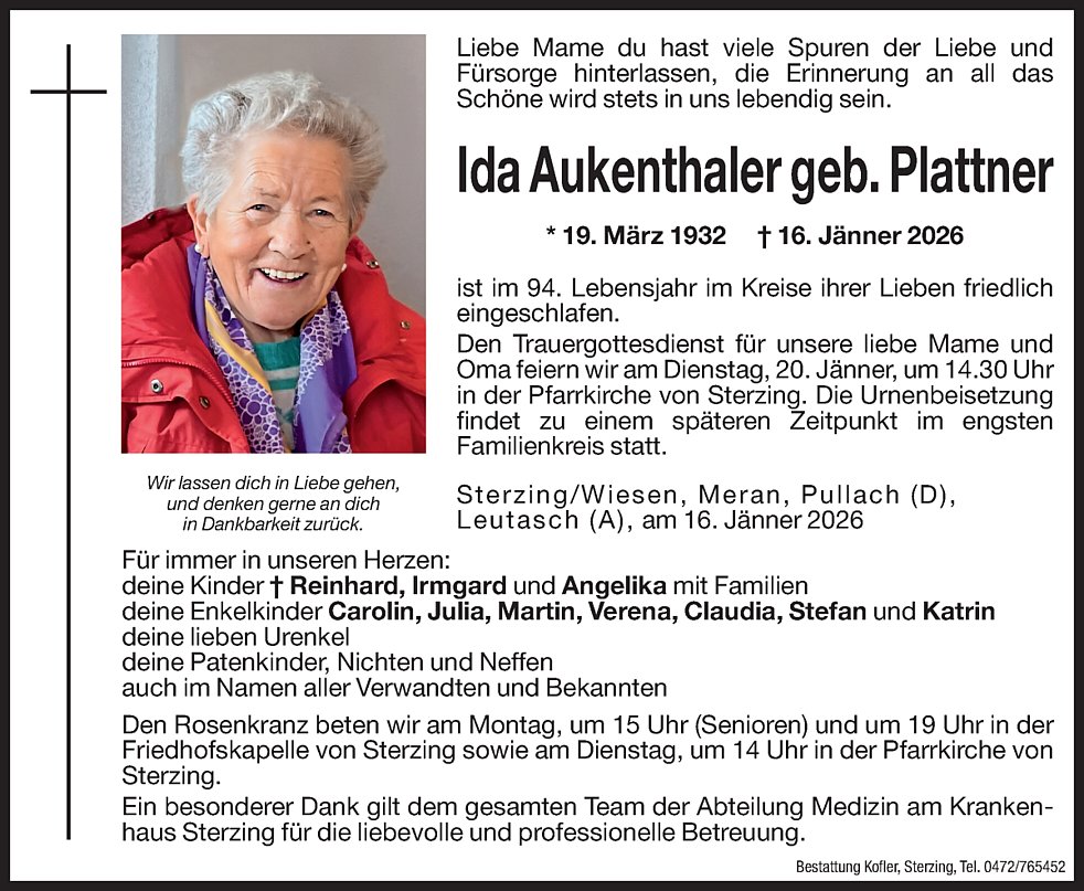 Den Trauergottesdienst für unsere liebe Mame und Oma feiern wir am Dienstag, 20. Jänner, um 14.30 Uhr in der Pfarrkirche von Sterzing. Die Urnenbeisetzung findet zu einem späteren Zeitpunkt im engsten Familienkreis statt.