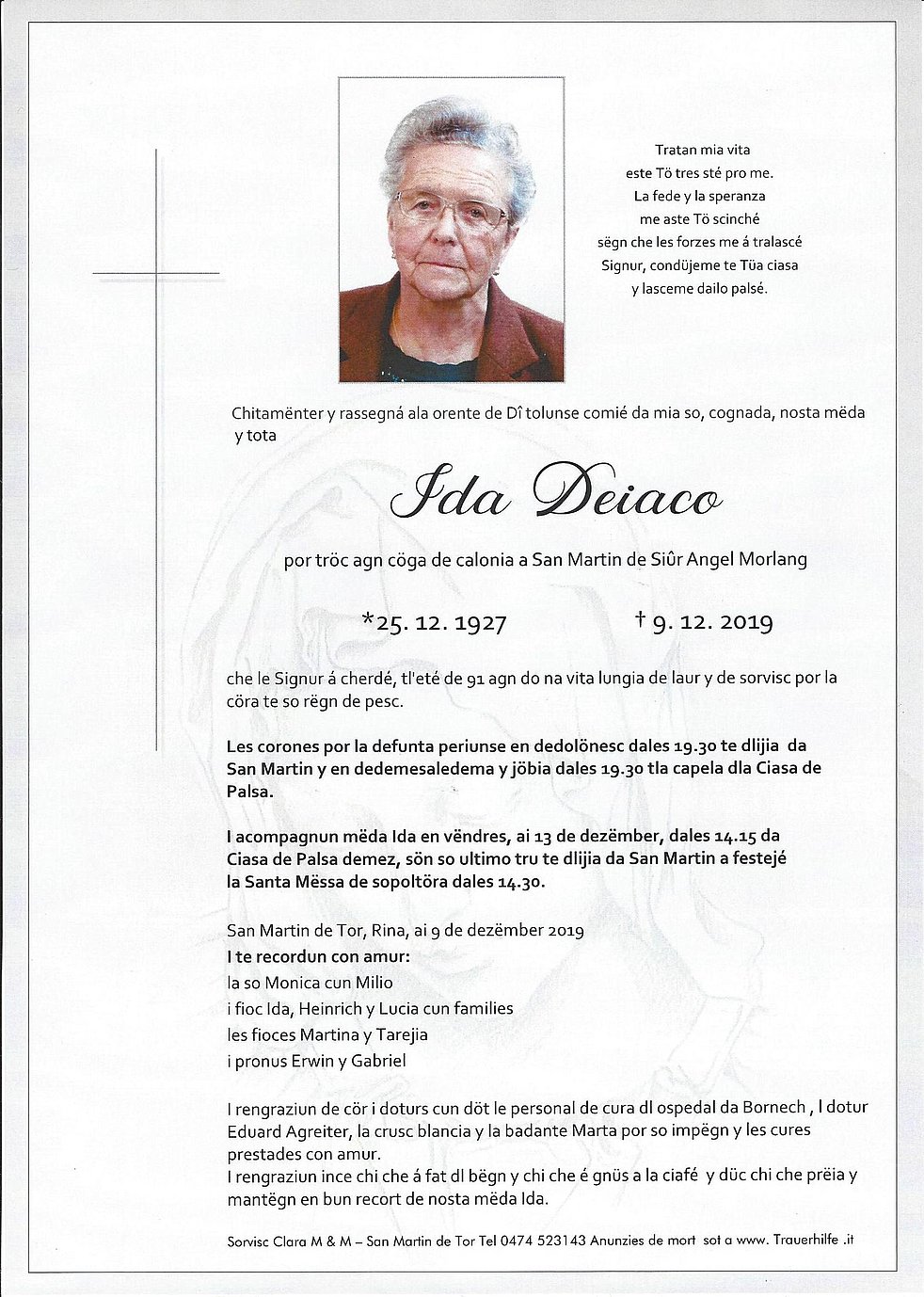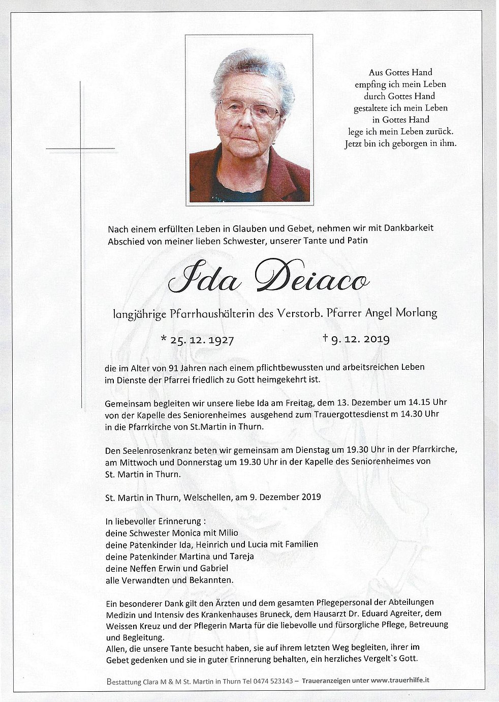 Gemeinsam begleiten wir unsere liebe Ida am Freitag, dem 13. Dezember um 14.15 Uhr von der Kapelle des Seniorenheimes ausgehend zum Trauergottesdienst um 14.30 Uhr in die Pfarrkirche von St. Martin in Thurn.