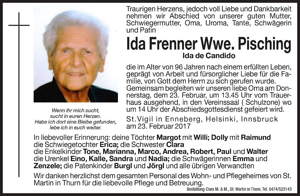 den 23. Februar, um 13.45 Uhr vom Trauerhaus ausgehend, in den Vereinssaal ( Schulzone) wo um 14 Uhr der Abschiedsgottesdienst gefeiert wird.