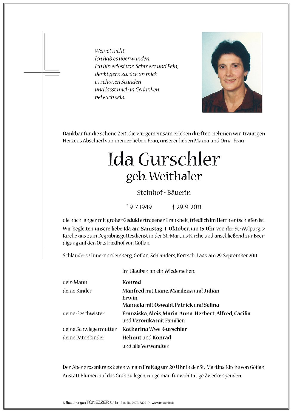 Wir begleiten unsere liebe Ida am Samstag, 1. Oktober, um 15 Uhr von der St.-Walpurgis-Kirche aus zum Begräbnisgottesdienst in der St.-Martins-Kirche und anschließend zur Beerdigung auf den Ortsfriedhof von Göflan.