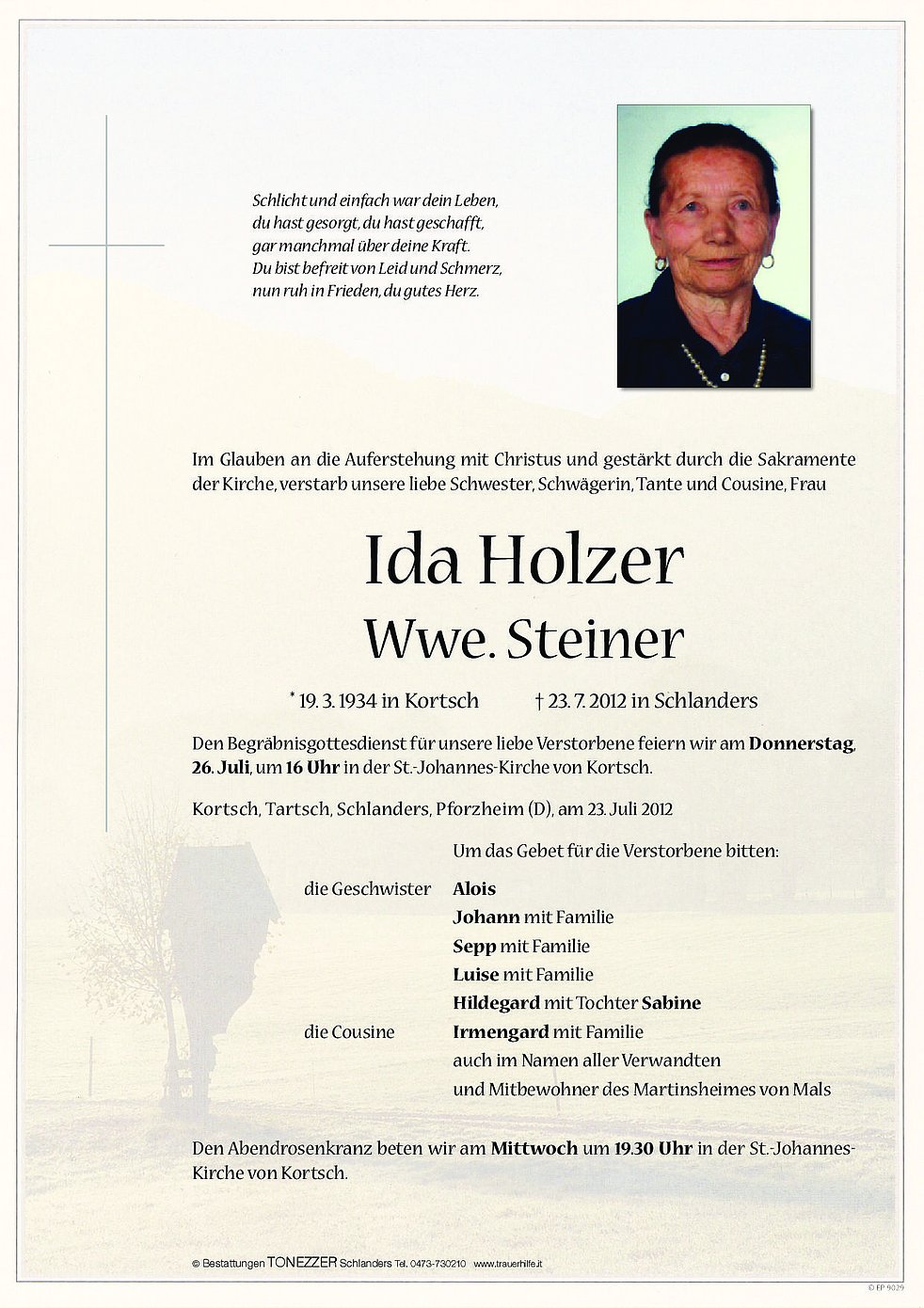Den Begräbnisgottesdienst für unsere liebe Verstorbene feiern wir am Donnerstag, 26. Juli, um 16 Uhr in der St.-Johannes-Kirche von Kortsch.