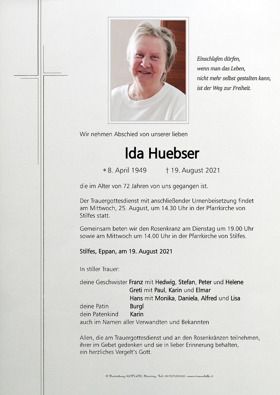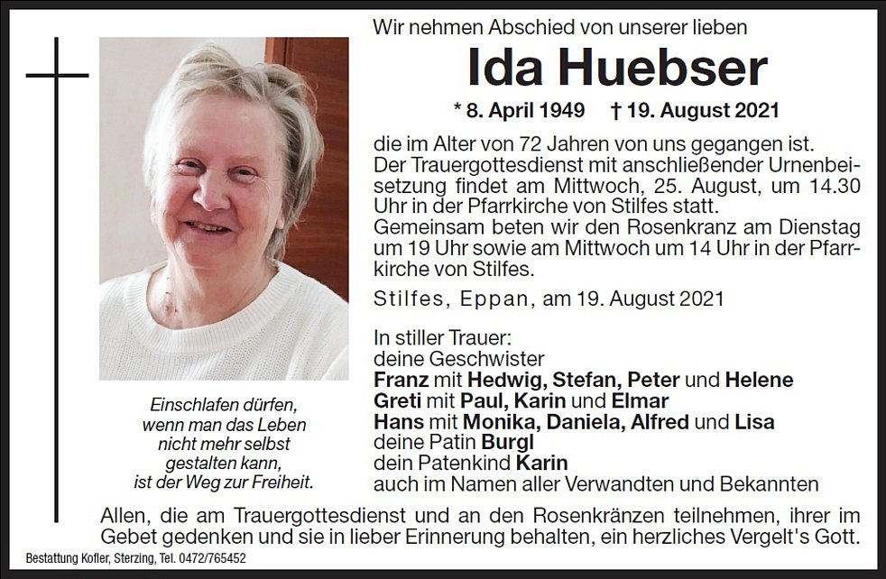 Der Trauergottesdienst mit anschließender Urnenbeisetzung findet am Mittwoch, 25. August, um 14.30 Uhr in der Pfarrkirche von Stilfes statt.