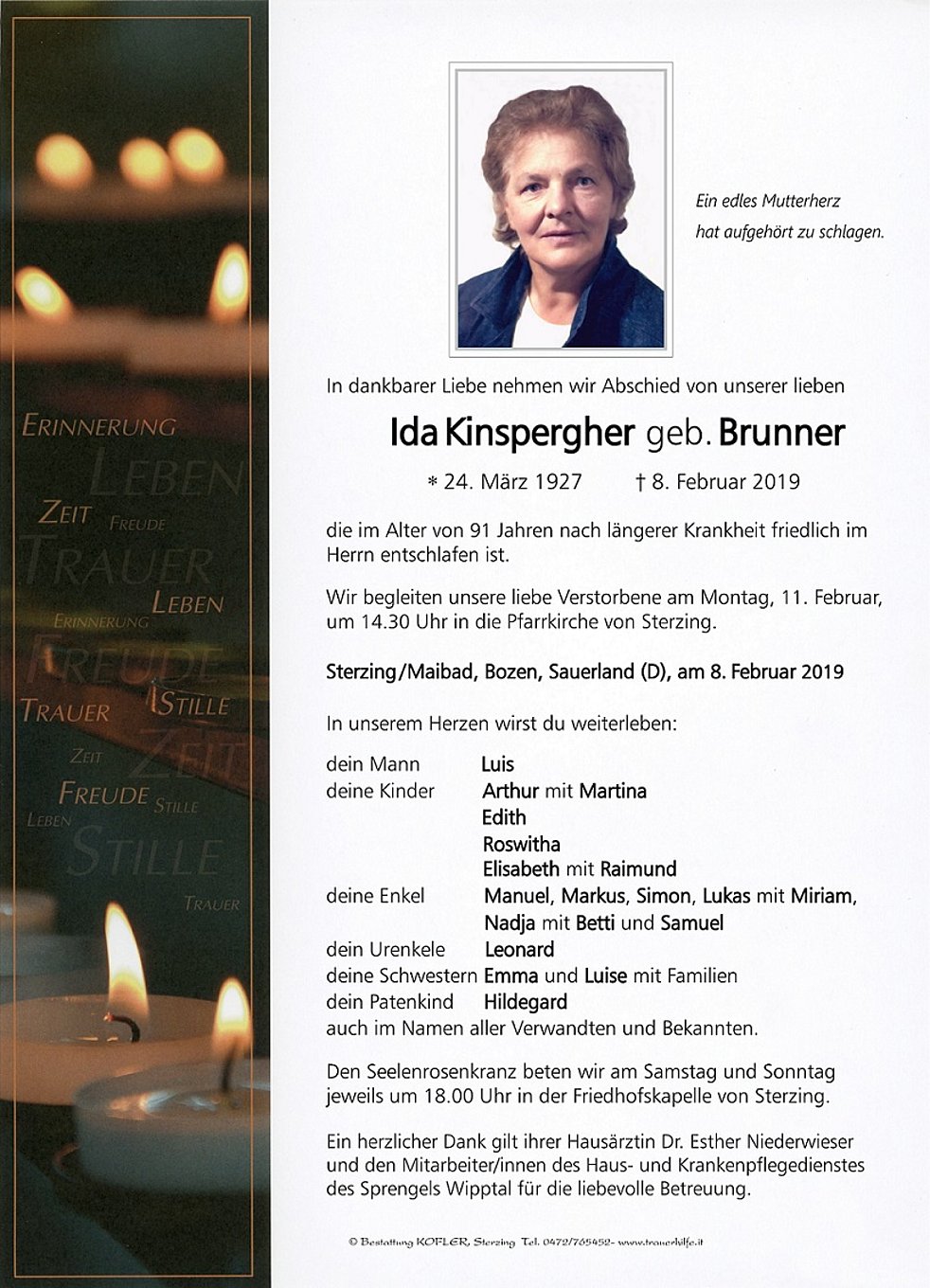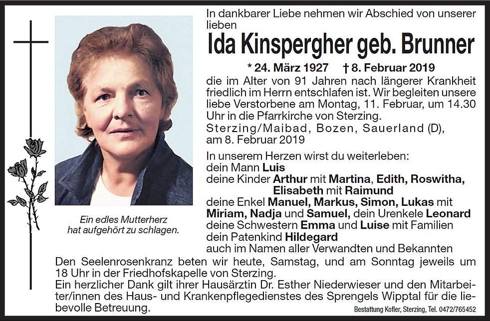 Wir begleiten unsere liebe Verstorbene am Montag, 11. Februar, um 14.30 Uhr in die Pfarrkirche von Sterzing.
