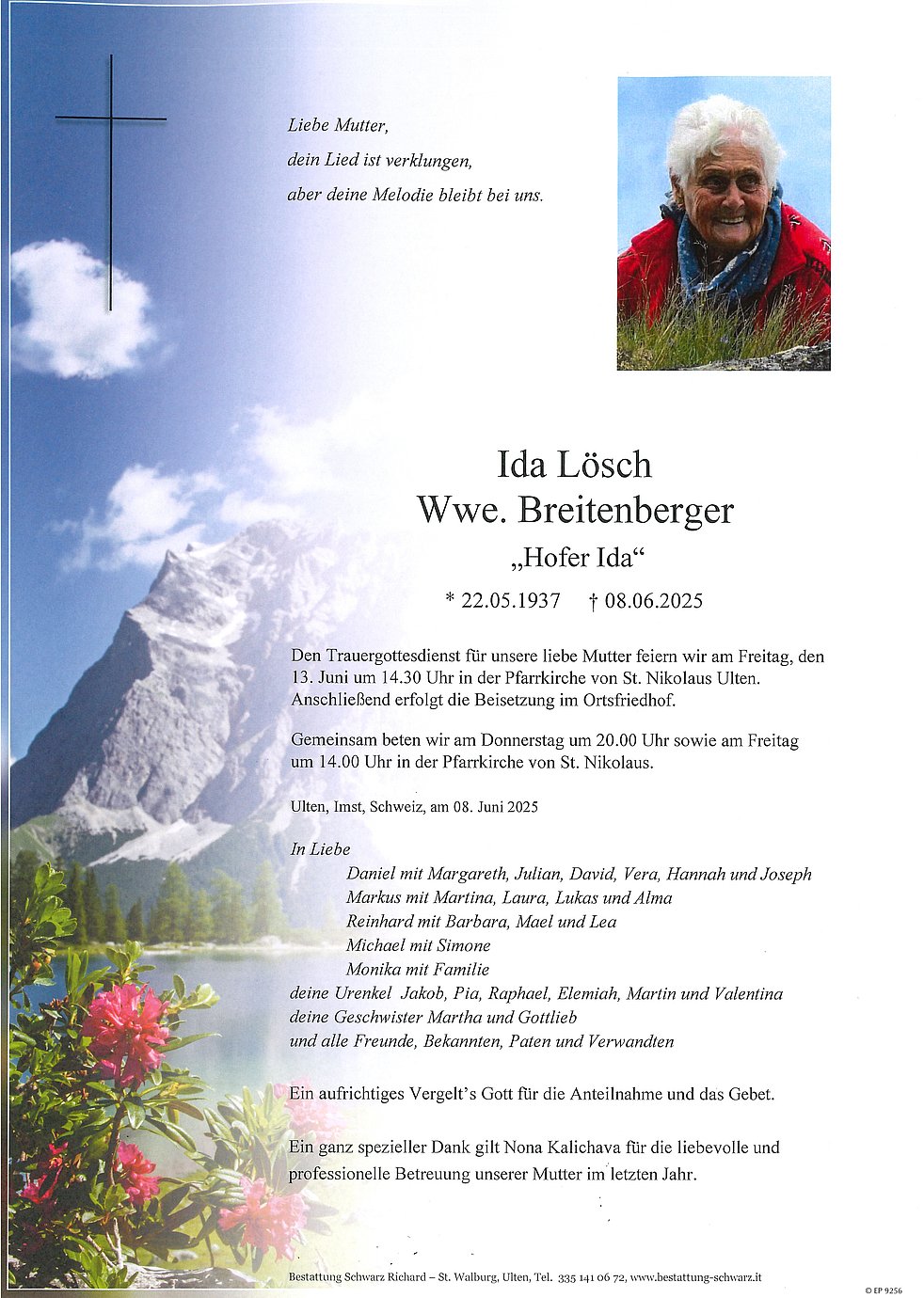 Den Trauergottesdienst für unsere liebe Mutter feiern wir am Freitag, den